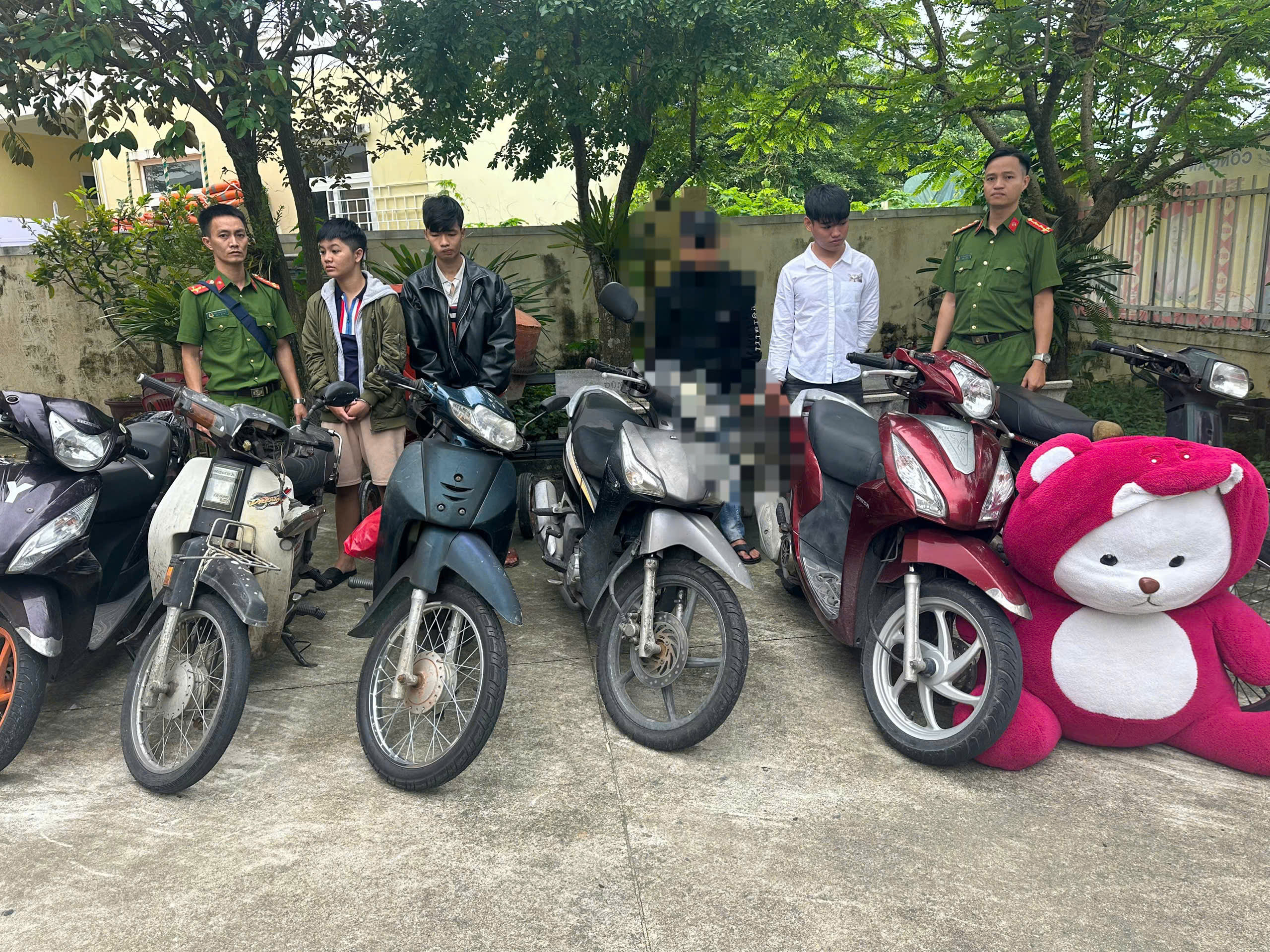 Các đối tượng khai nhận đã thực hiện 11 vụ trộm cắp xe máy trên địa bàn Đà Nẵng trong thời gian qua. Tang vật tạm giữ gồm 6 chiếc xe máy. Ngoài trộm xe, nhóm này còn “tiện tay” trộm một con gấu dâu thật to của người dân.