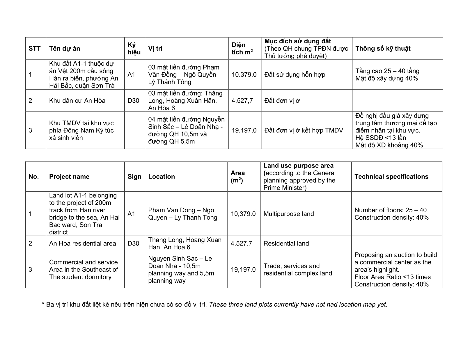 Theo đó, các lô đất với tổng diện tích quy hoạch gần 340.000m2 đã được quy hoạch thuộc các lĩnh vực nhà ở, thương mại dịch vụ, giáo dục – đào tạo, y tế phân bổ ở các quận Sơn Trà, Cẩm Lệ, Ngũ Hành Sơn và huyện Hòa Vang, thành phố Đà Nẵng.