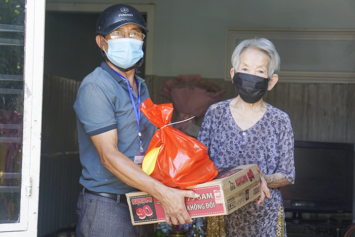 Trao quà lương thực, thực phẩm thiết yếu đến từng hộ dân khó khăn