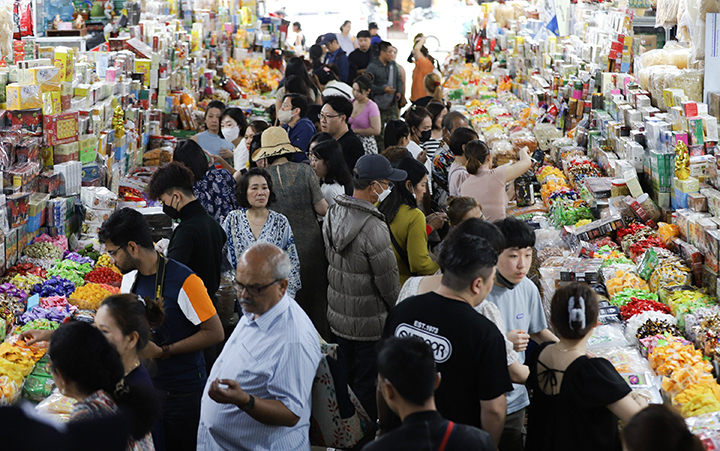 Khách du lịch mua sắm tại chợ Hàn. ẢNH: THANH THẢO