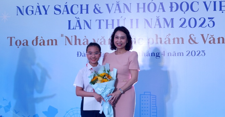 Phó Giám đốc Sở Văn hoá và Thể thao Nguyễn Thị Hội An tặng hoa Đại sứ văn hoá đọc thành phố Đà Nẵng năm 2022