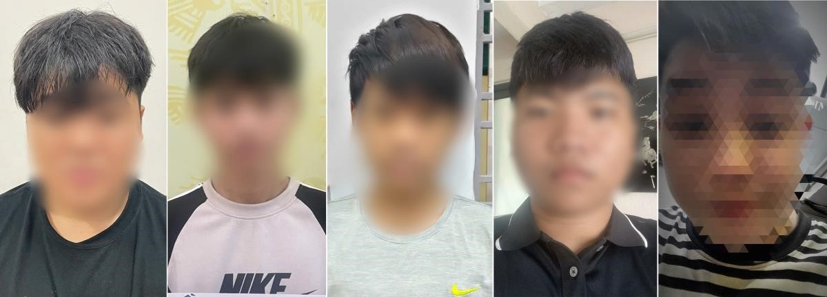 (Từ trái sang) - Nhóm đối tượng trộm cắp gồm Bảo, Huy, Hiếu và hai đối tượng tiêu thụ là Tuấn, Hưng
