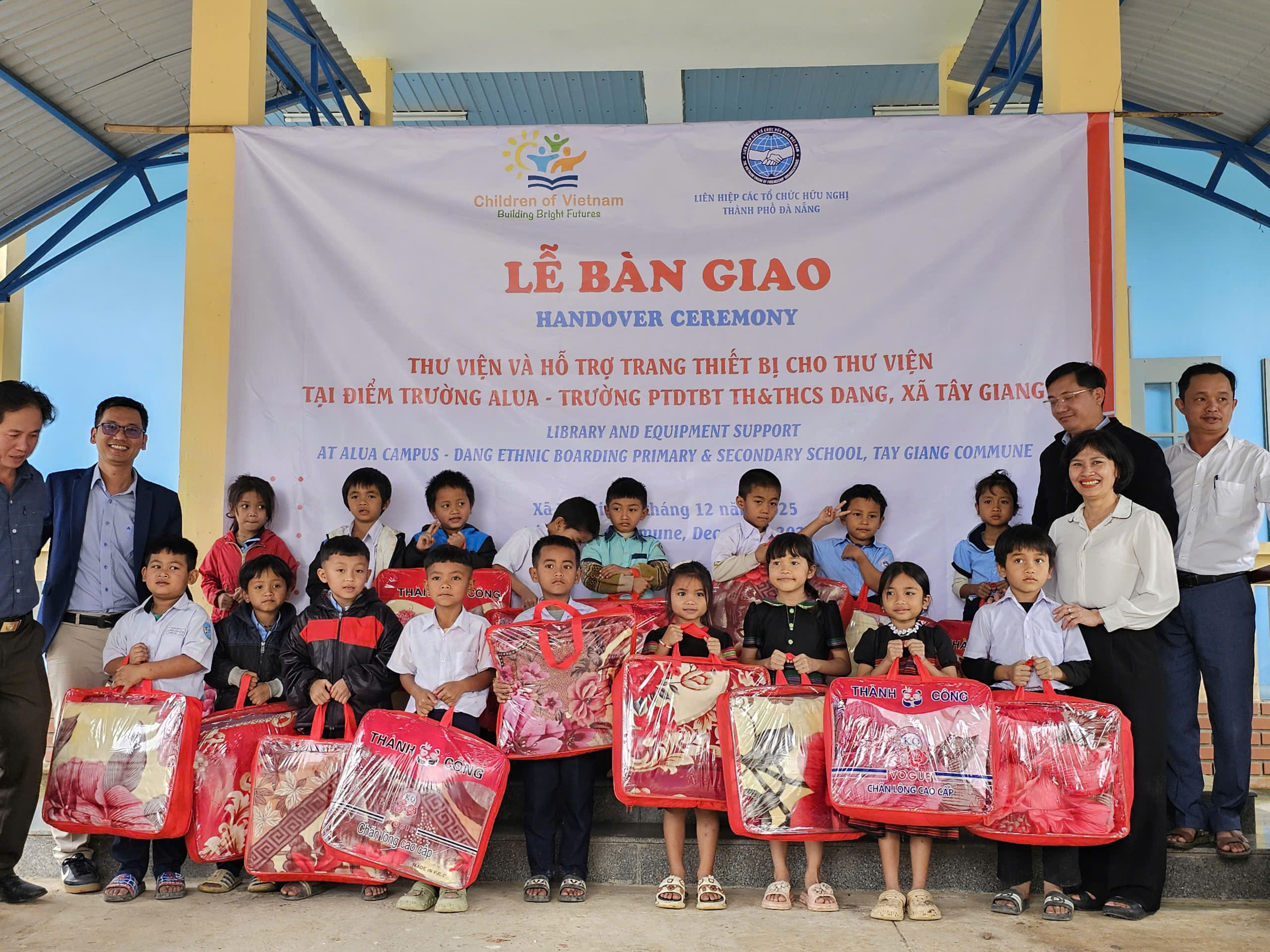 Sáng 17-12, tại Điểm trường Alua – Trường Phổ thông Dân tộc Bán trú Tiểu học & THCS Dang (xã Tây Giang), Liên hiệp các tổ chức hữu nghị thành phố Đà Nẵng phối hợp với Tổ chức Children of Vietnam (COV) tổ chức Lễ bàn giao Thư viện và hỗ trợ trang thiết bị thư viện cho nhà trường.