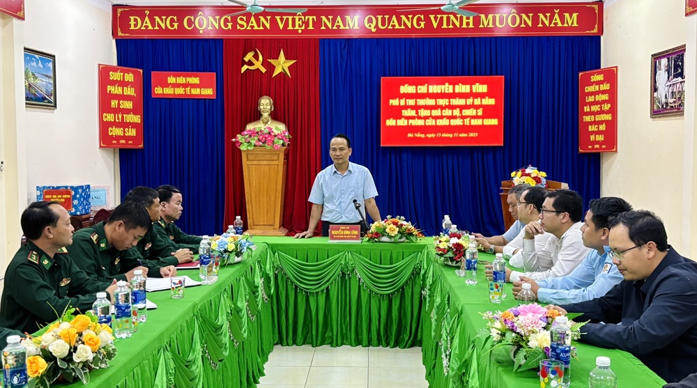 Phát biểu tại buổi làm việc, Phó Bí thư Thường trực Thành ủy Nguyễn Đình Vĩnh biểu dương tinh thần trách nhiệm, sự mưu trí và nỗ lực của cán bộ, chiến sĩ Đồn Biên phòng Cửa khẩu quốc tế Nam Giang trong bảo đảm quốc phòng – an ninh, giữ gìn bình yên khu vực biên giới và đồng hành cùng nhân dân trong phòng chống thiên tai.