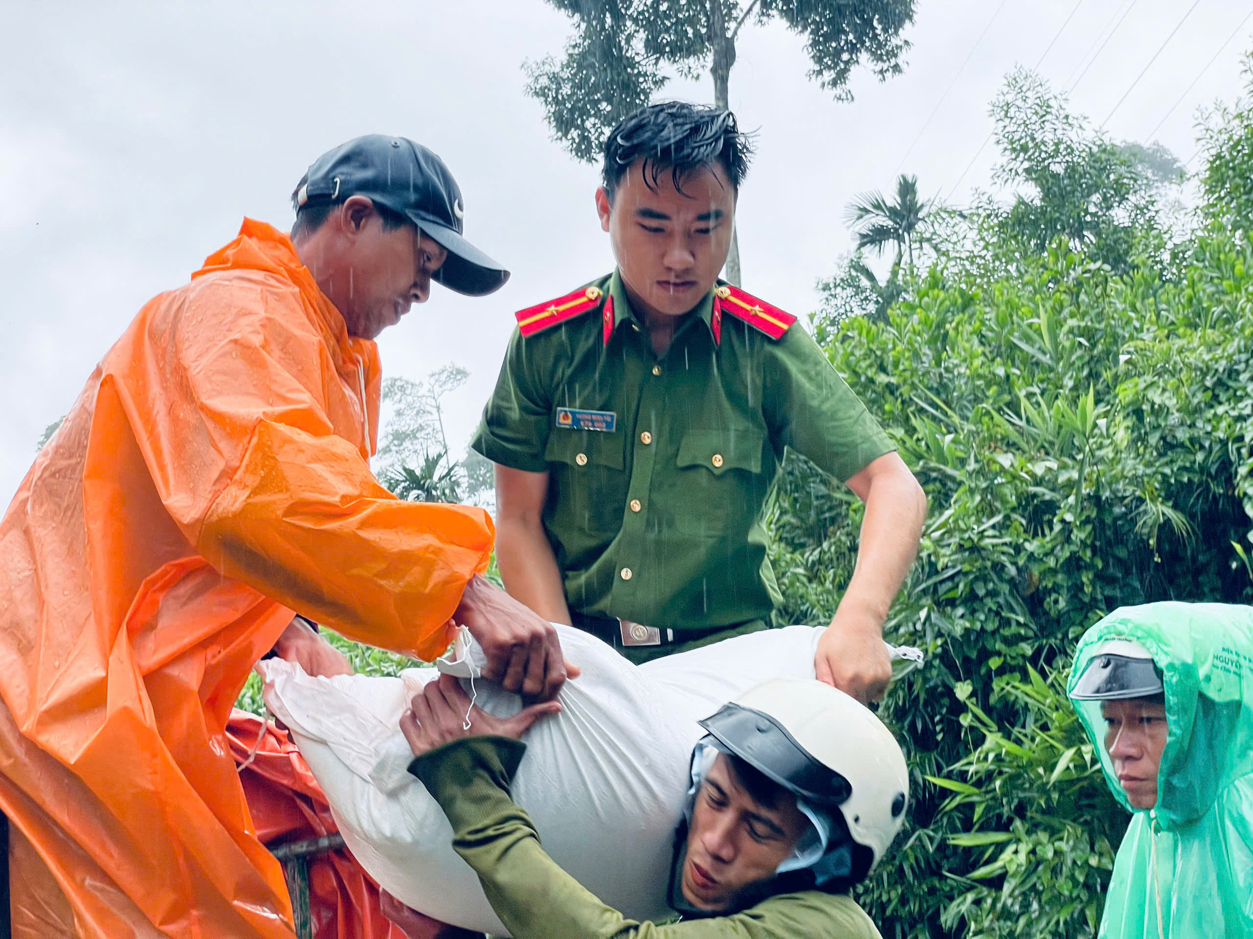 Tại xã Trà Tập, hàng chục cán bộ, chiến sĩ Công an, dân quân và đoàn viên thanh niên đã vận chuyển 01 tấn gạo cùng nhu yếu phẩm vào làng Tu Nương, thôn 8. Nơi đây có 54 hộ với hơn 270 nhân khẩu, cách xa trung tâm xã. Mưa lớn nhiều ngày, giao thông chia cắt khiến đời sống người dân trong làng gặp rất nhiều khó khăn.