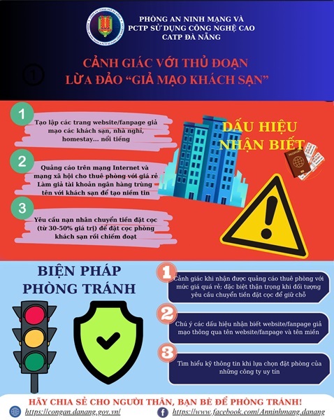 Đồng thời chú ý các dấu hiệu nhận biết website/fapage giả mạo và tìm hiểu và xác minh kỹ thông tin về vị trí, cơ sở vật chất của nơi ở cũng như lai lịch của người cung cấp dịch vụ. Tuyệt đối không chuyển tiền đặt cọc đối với những khách sạn, nhà nghỉ ít được nhiều người biết đến. Khi phát hiện dấu hiệu lừa đảo, người dân cần trình báo ngay cho cơ quan Công an gần nhất để được hỗ trợ.