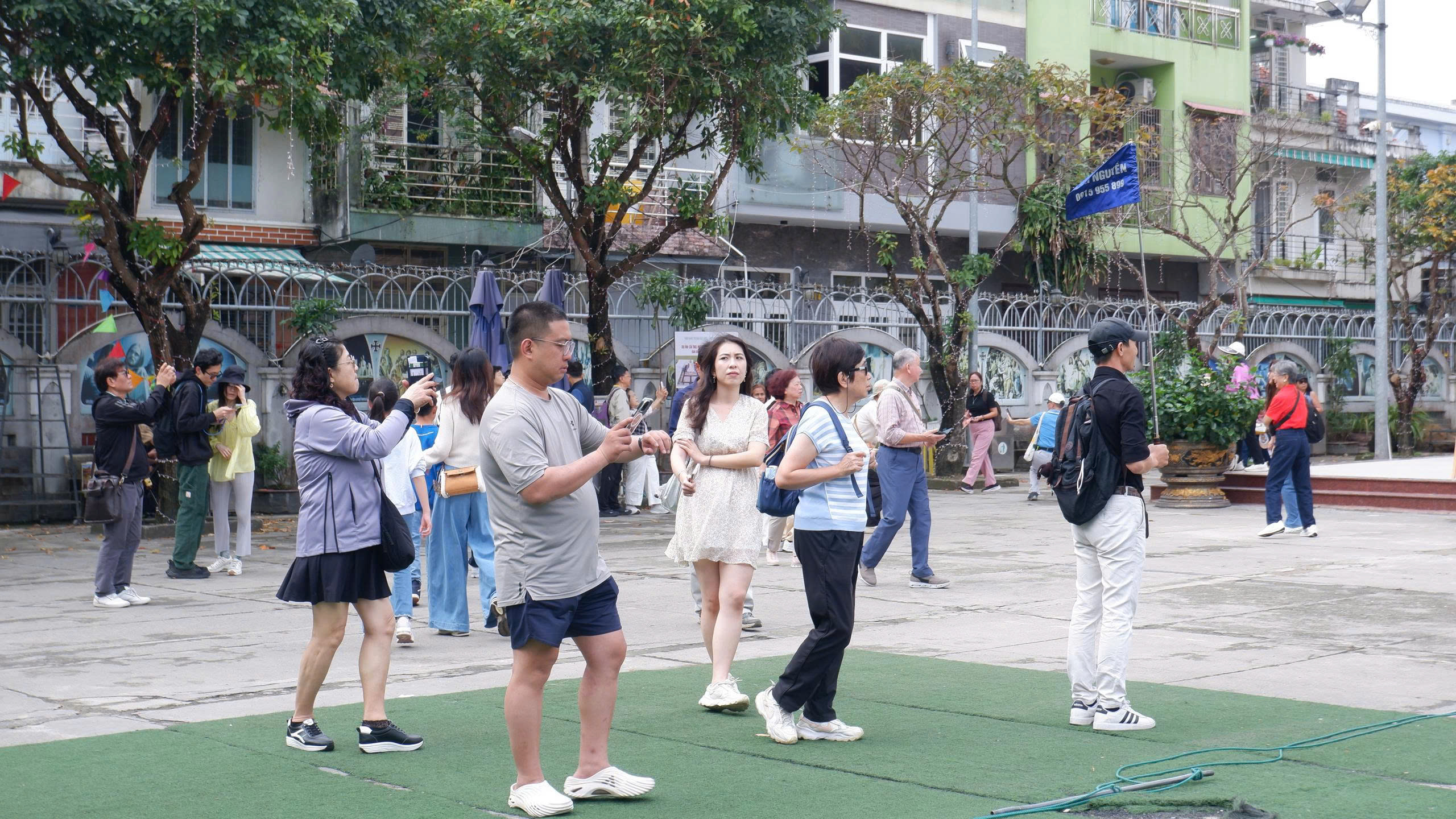 Trước cổng Nhà thờ Chính tòa Đà Nẵng, nhiều nhóm du khách dừng lại chụp ảnh lưu niệm. Với vẻ đẹp cổ kính, không gian yên bình của công trình khiến nơi đây trở thành điểm dừng chân yêu thích trong hành trình tham quan trung tâm thành phố.