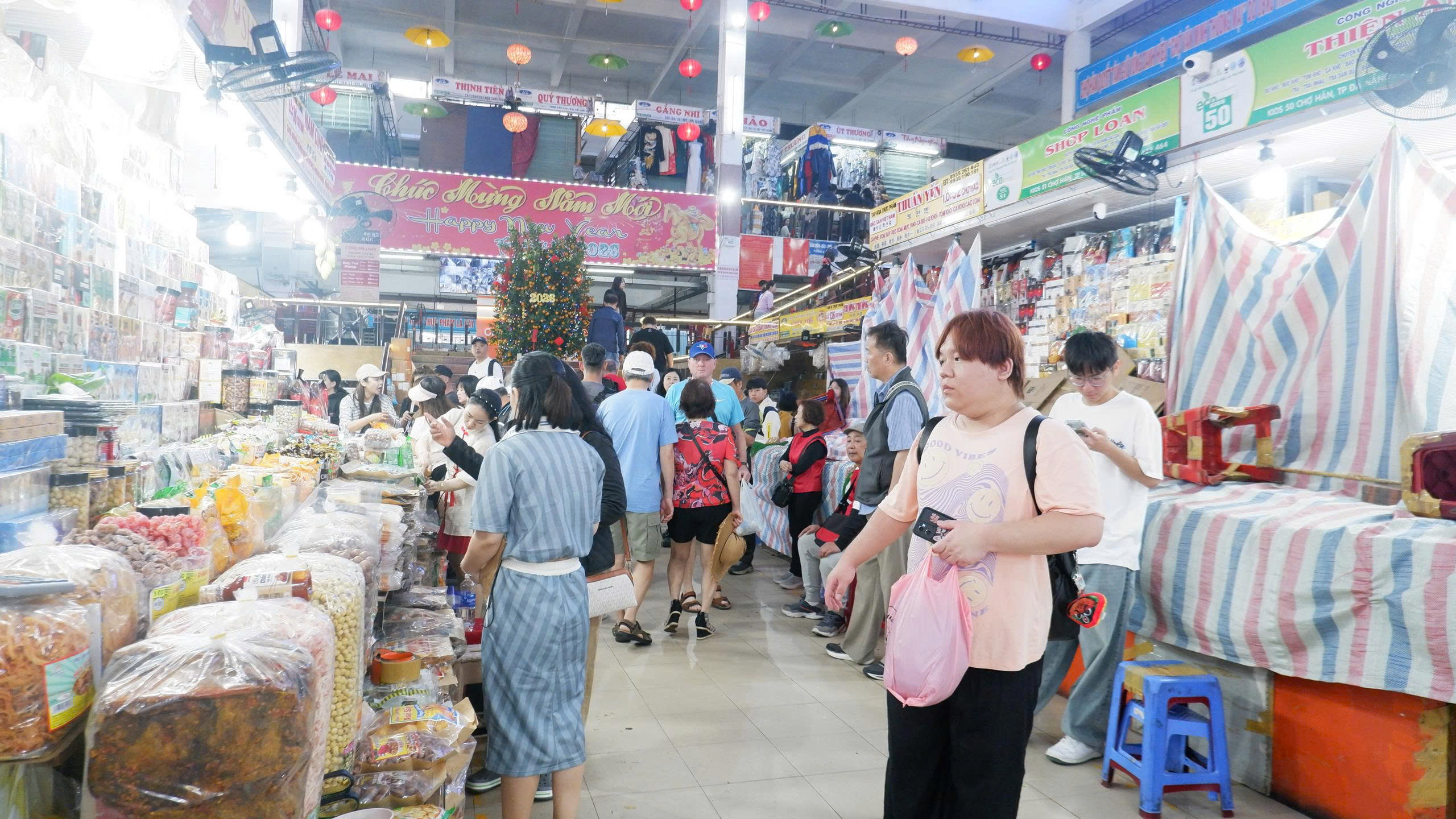 Theo một tiểu thương kinh doanh đặc sản khô tại chợ, du khách nước ngoài thường quan tâm đến sản phẩm có thể mang về làm quà. Thông thường, họ hay mua cà phê, hạt điều, trái cây sấy. Họ hỏi kỹ về hạn sử dụng, cách đóng gói. Những ngày Tết, tuy không đông như mùa cao điểm nhưng khách Hàn vẫn ghé đều.