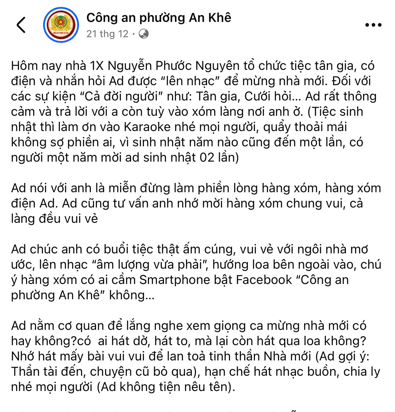 Thông qua Facebook, Công an phường An Khê còn gửi lời chúc đến chủ nhà có buổi tiệc ấm cúng, vui vẻ với ngôi nhà mơ ước. Nhưng phải mở nhạc với âm lượng vừa phải, hướng loa bên ngoài vào. “Câu chuyện có thật tại phường An Khê. Khi người dân ngộ ra pháp luật, tự nhiên thấy văn minh hẳn”, kết bài đăng.