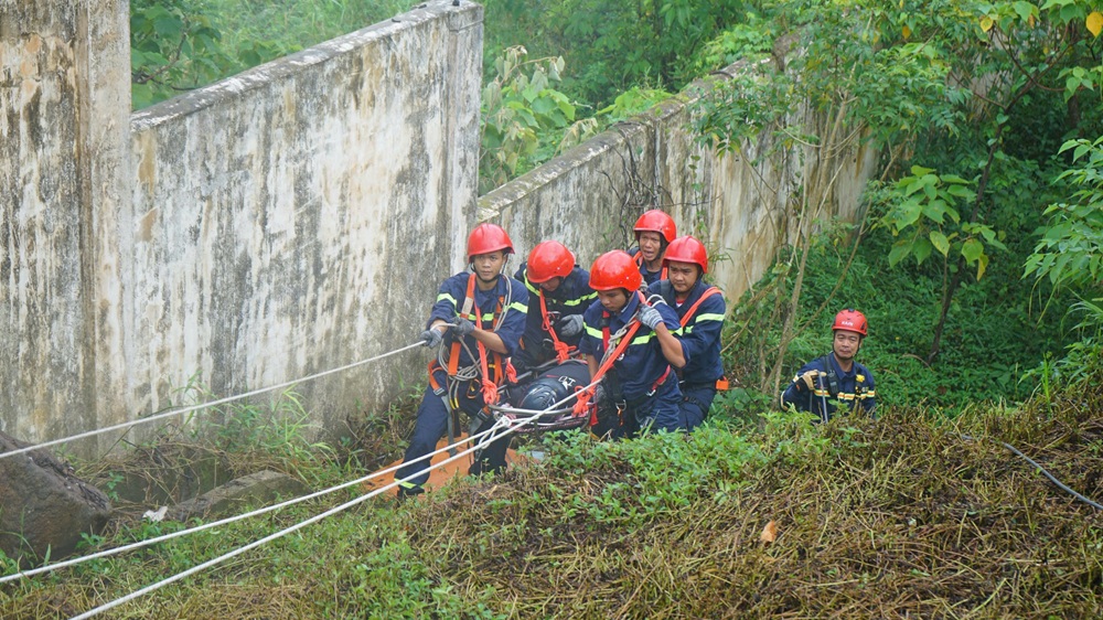 Ngay khi nhận tin báo, lực lượng PCCC&CNCH Công an TP nhanh chóng điều động hàng chục cán bộ, chiến sỹ cùng 4 xe chữa cháy, cứu nạn cứu hộ đến hiện trường. Khu vực được phong tỏa, lực lượng chuyên môn triển khai phương án tiếp cận sườn dốc, dùng dây, ròng rọc và thiết bị chuyên dụng để đưa nạn nhân ra khỏi khu vực cây cỏ rậm rạp và địa hình cực kỳ nguy hiểm.
