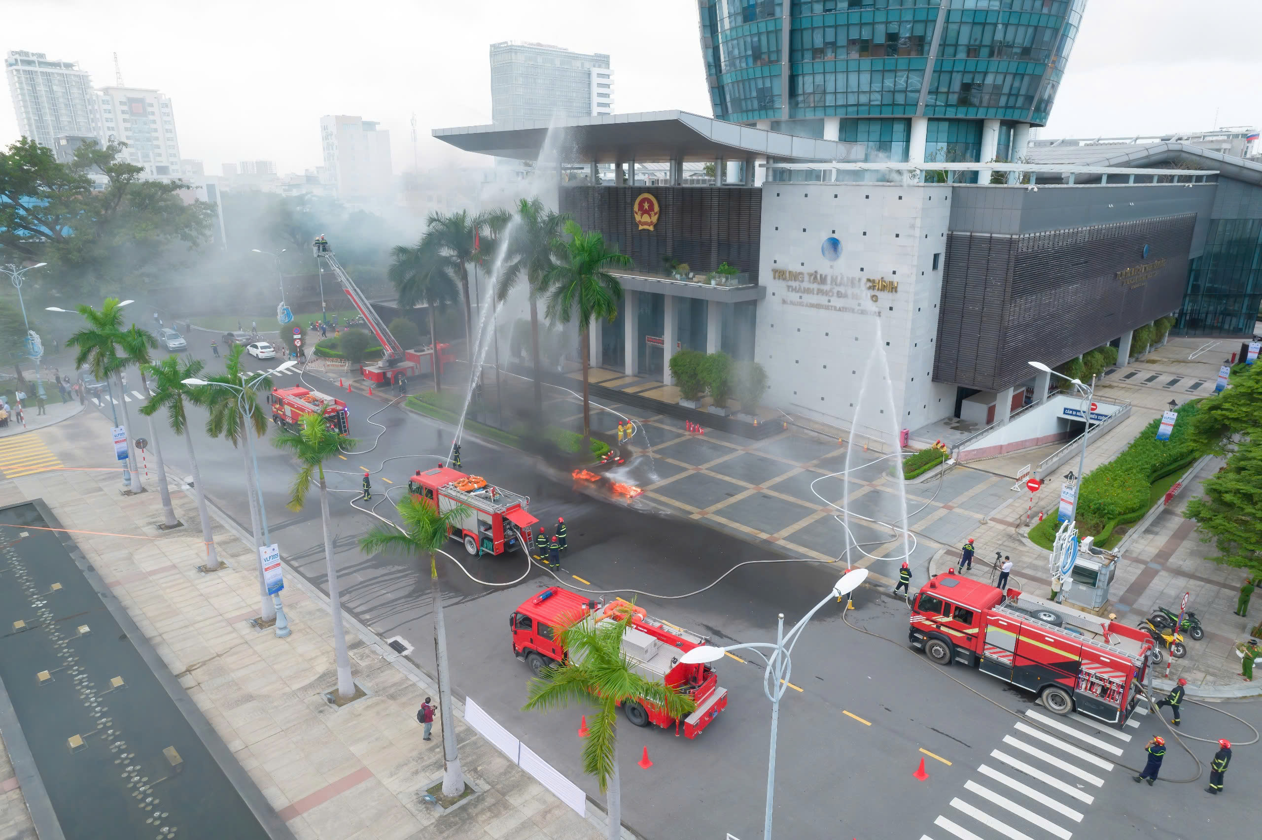 Chiều 05-12, Văn phòng UBND thành phố tổ chức diễn tập phòng cháy chữa cháy và cứu nạn, cứu hộ (PCCC&CNCH) tại tòa nhà Trung tâm hành chính thành phố (phường Hải Châu).