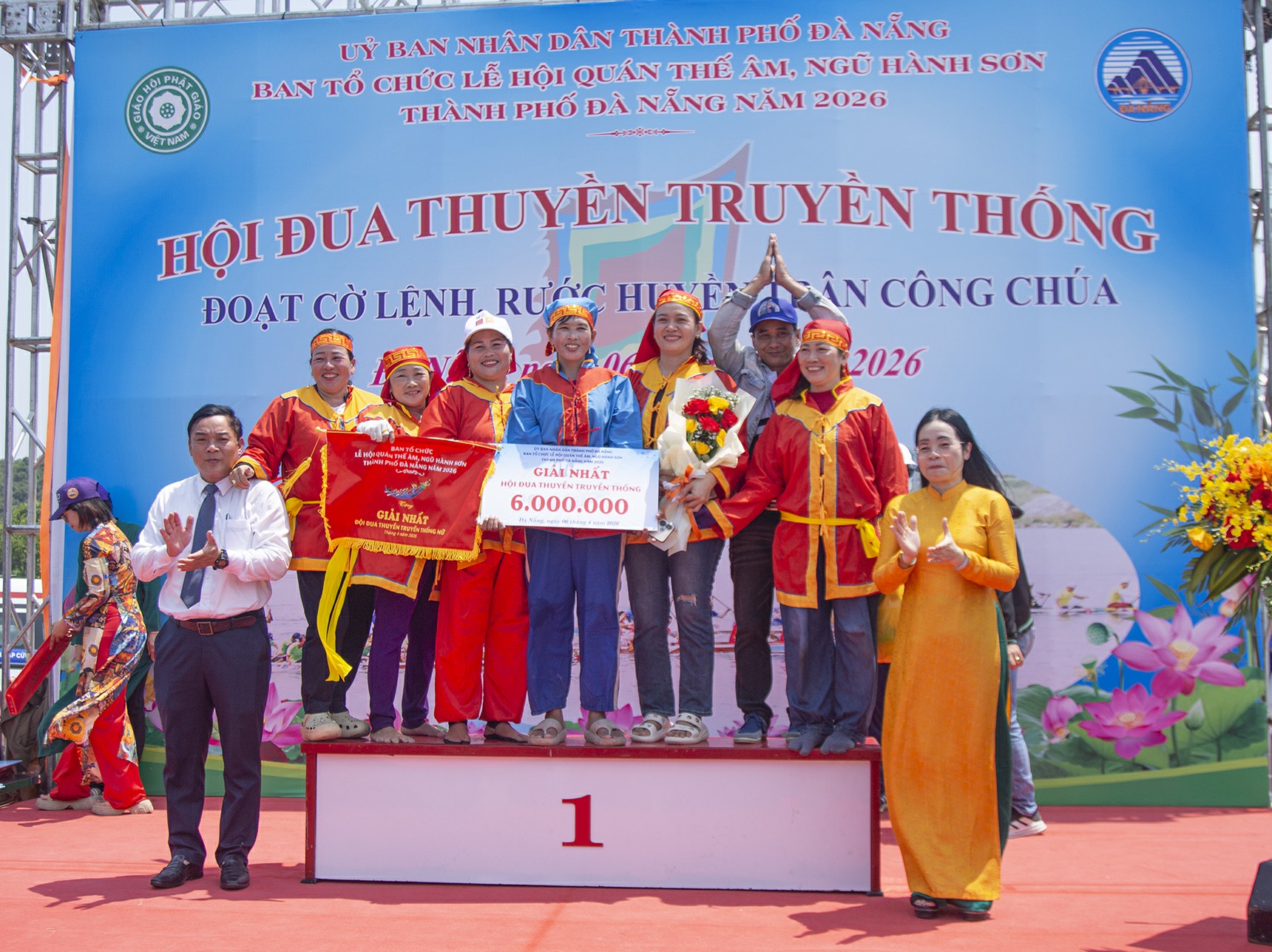 Sáng 06-4, tại khu vực sông Cổ Cò (phường Ngũ Hành Sơn), giải đua thuyền truyền thống đoạt cờ lệnh rước Huyền Trân Công chúa trong khuôn khổ Lễ hội Quán Thế Âm Ngũ Hành Sơn 2026 diễn ra sôi nổi, thu hút đông đảo người dân và du khách đón xem.