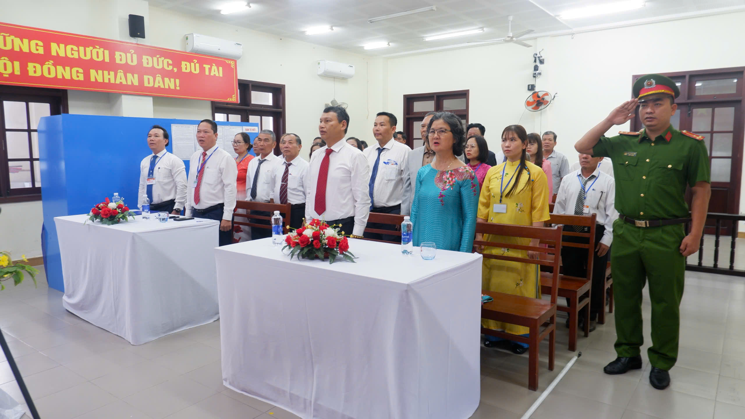 Trong không khí trang nghiêm, đúng quy định, các đại biểu và cử tri đã thực hiện nghi thức chào cờ, nghe công bố các quy định về bầu cử, danh sách ứng cử viên đại biểu Quốc hội và đại biểu HĐND các cấp, cũng như hướng dẫn quy trình bỏ phiếu theo đúng quy định của pháp luật.