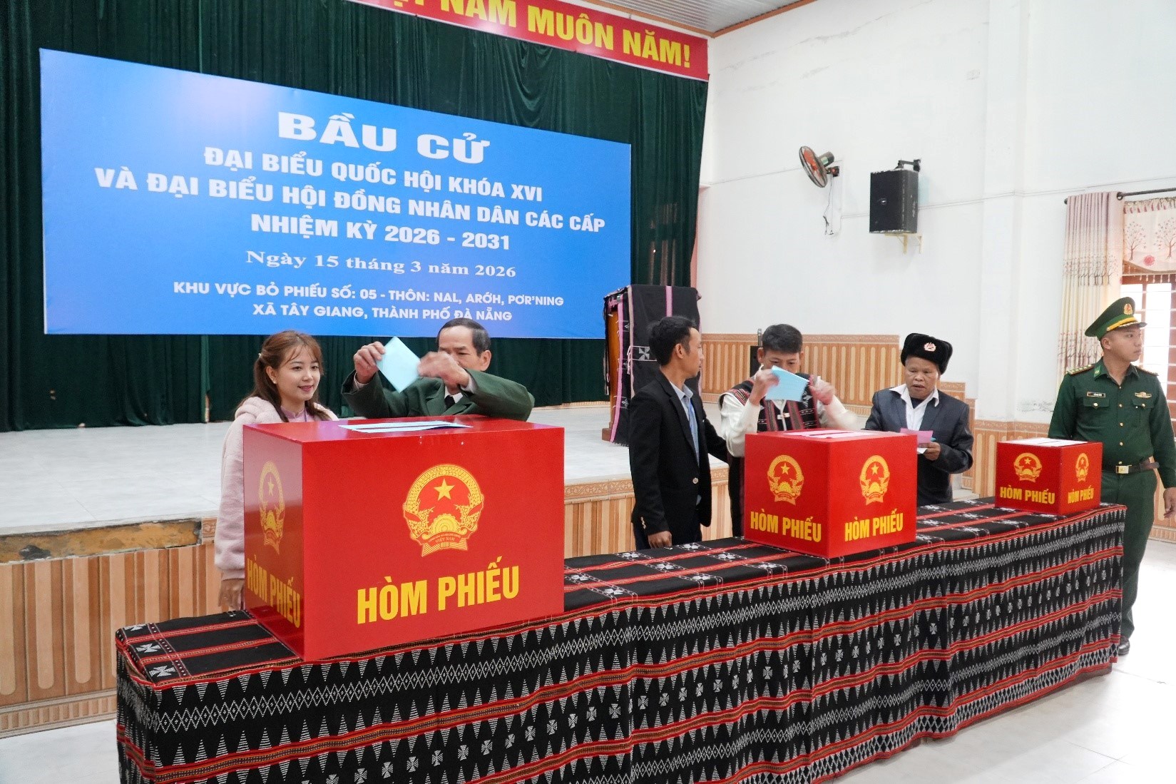 Nhiều cử tri mặc trang phục truyền thống Cơ Tu rực rỡ, tay cầm thẻ cử tri, phấn khởi thực hiện quyền bầu cử, lựa chọn những đại biểu tiêu biểu đại diện cho ý chí và nguyện vọng của nhân dân.