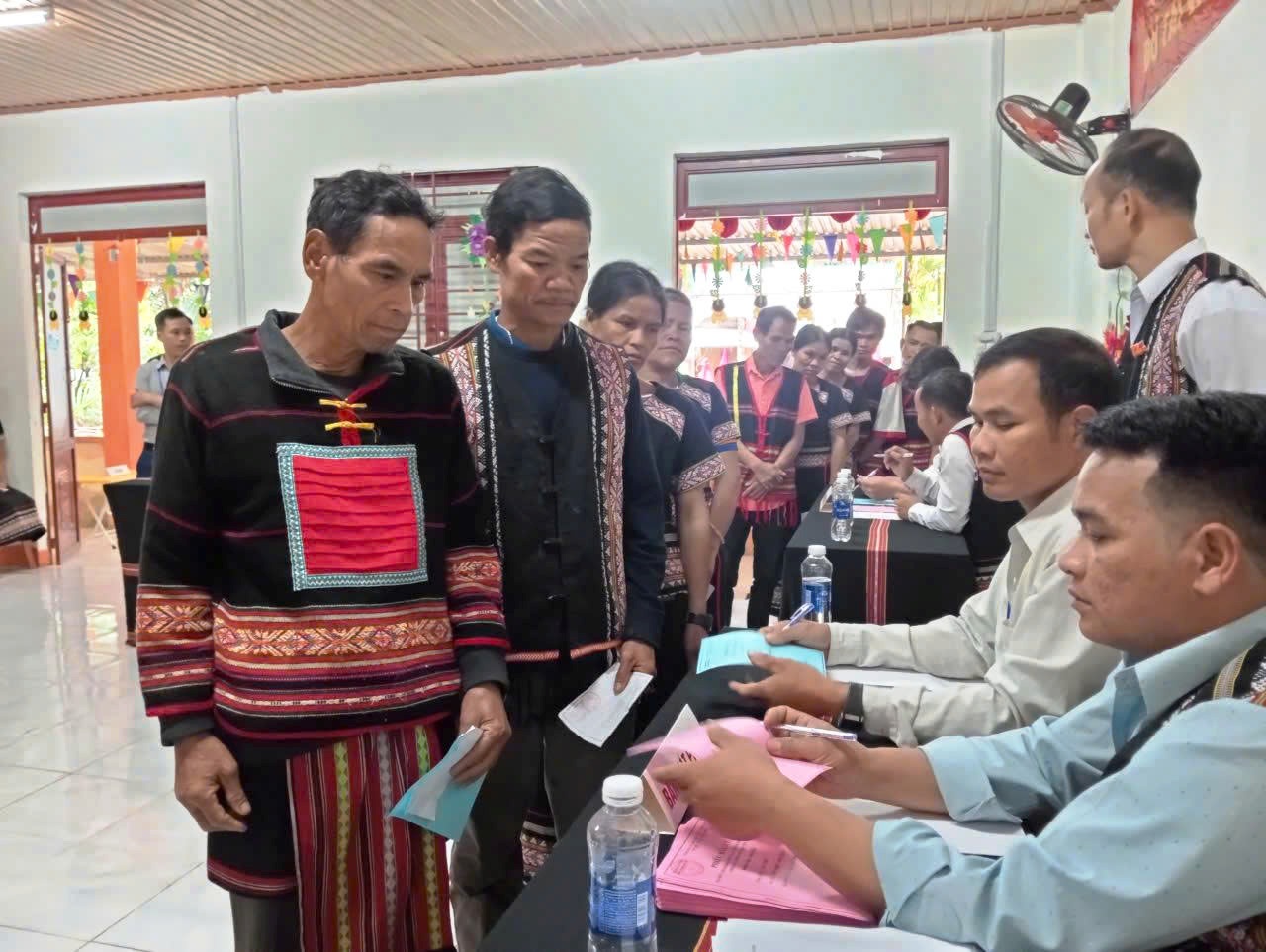 Cử tri có mặt tại các điểm bỏ phiếu trong không khí vui tươi nhưng nghiêm túc. Bà con đến theo từng nhóm nhỏ; có người đi bộ từ các nóc làng xa, có người tranh thủ đi bỏ phiếu sớm trước khi lên rẫy. Các thành viên tổ bầu cử cũng có mặt từ sớm để kiểm tra danh sách, phát phiếu và hướng dẫn cử tri thực hiện đúng quy trình bỏ phiếu.
