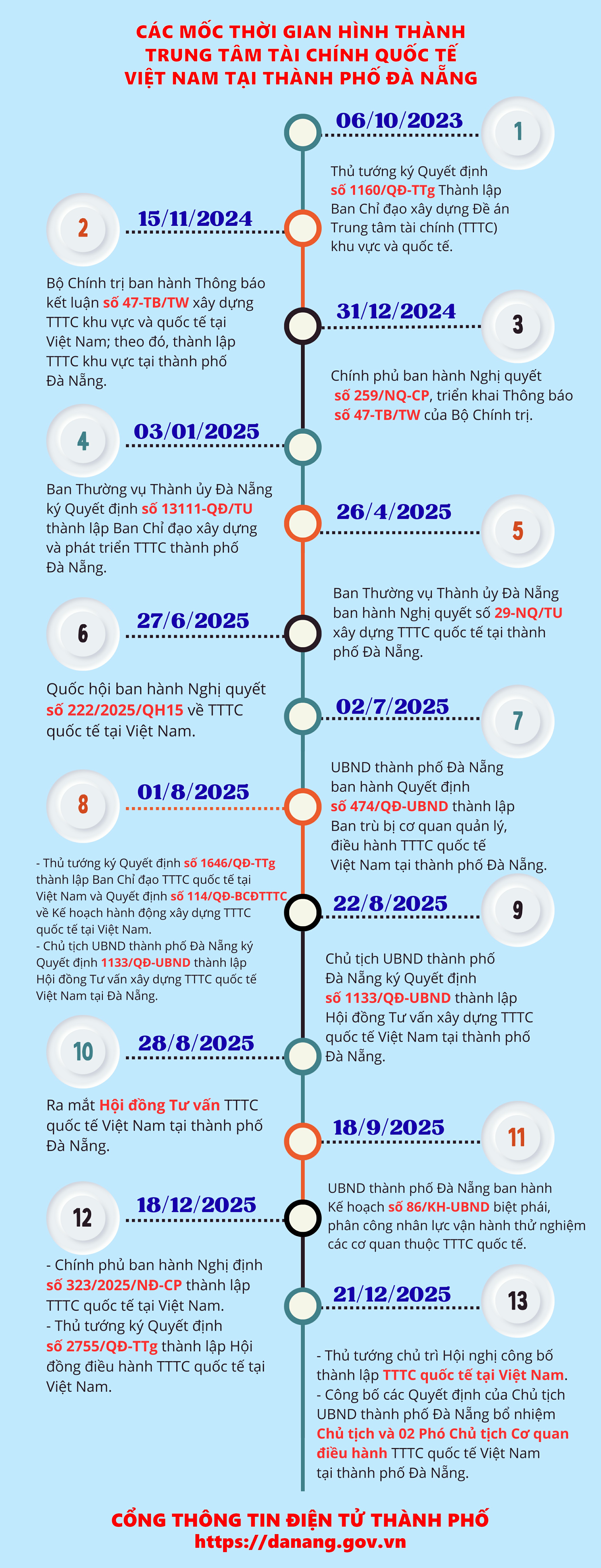 Ngày 21-12-2025, Chính phủ công bố quyết định thành lập Trung tâm tài chính quốc tế Việt Nam tại thành phố Đà Nẵng. Cổng TTĐT TP điểm lại những mốc thời gian nổi bật trong quá trình xây dựng, tổ chức và chính thức công bố thành lập Trung tâm, khẳng định quyết tâm đưa Đà Nẵng trở thành điểm đến tài chính quốc tế mới của khu vực.