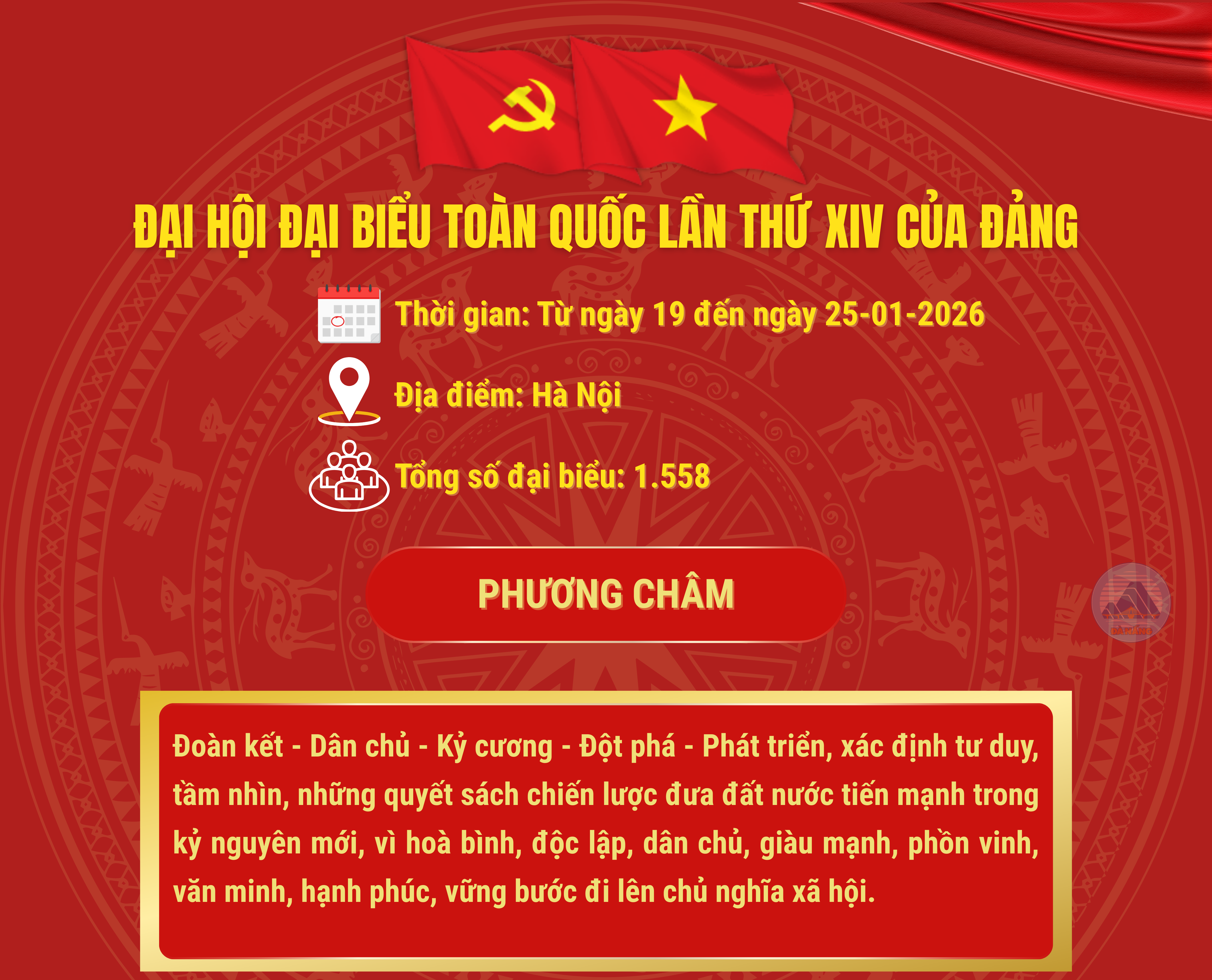 Đại hội đại biểu toàn quốc lần thứ XIV của Đảng với phương châm "Đoàn kết - Dân chủ - Kỷ cương - Đột phá- Phát triển, xác định tư duy, tầm nhìn, những quyết sách chiến lược đưa đất nước tiến mạnh trong kỷ nguyên mới, vì hoà bình, độc lập, dân chủ, giàu mạnh, phồn vinh, văn minh, hạnh phúc, vững bước đi lên chủ nghĩa xã hội".