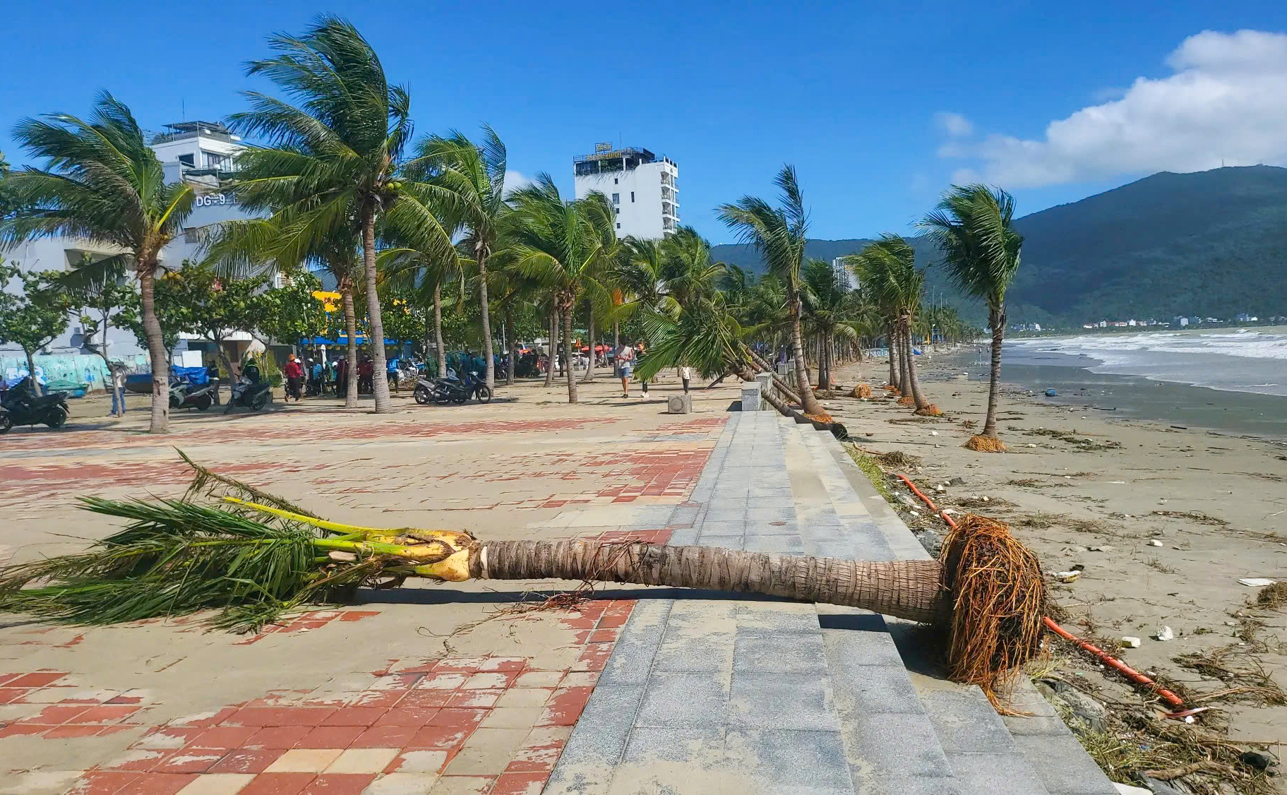 Tại khu vực bãi biển phường Sơn Trà, do ảnh hưởng của gió mạnh trong đêm 6-11, một số cây dừa bị bật gốc, ảnh hưởng đến cảnh quan đô thị và du lịch ven biển.