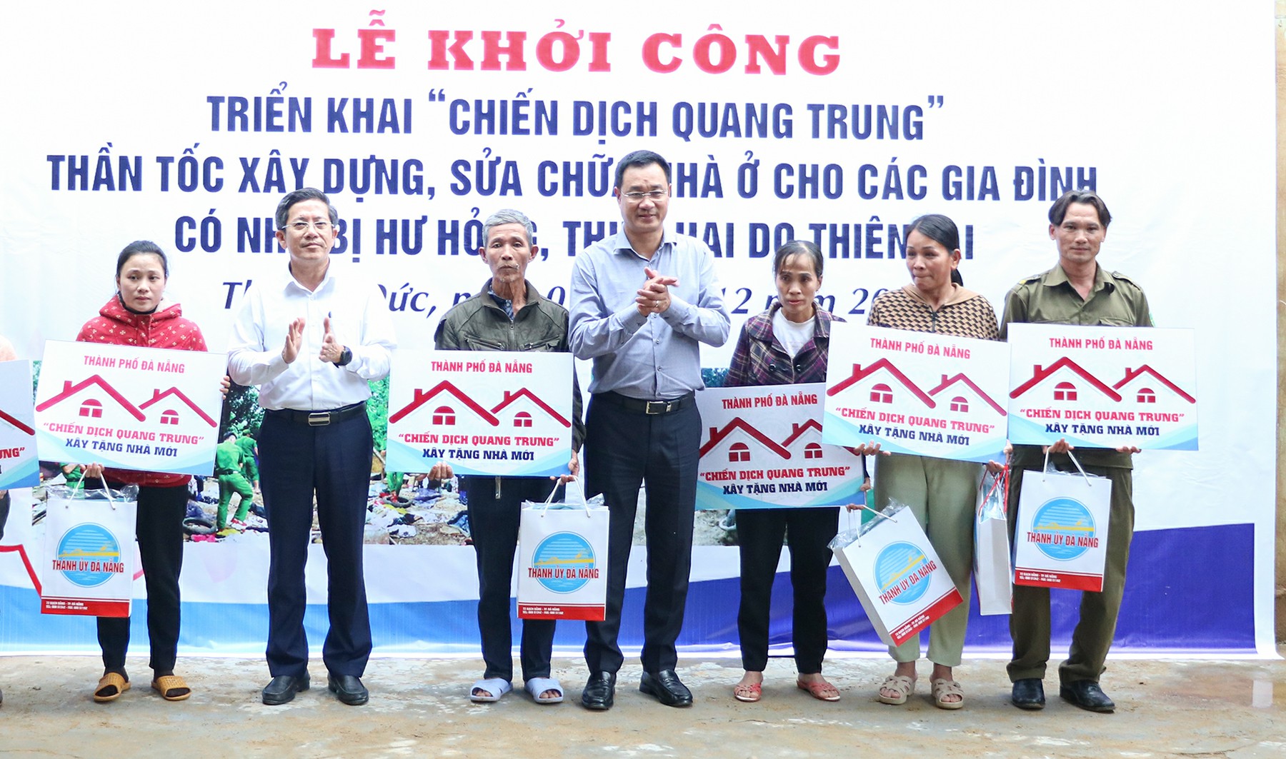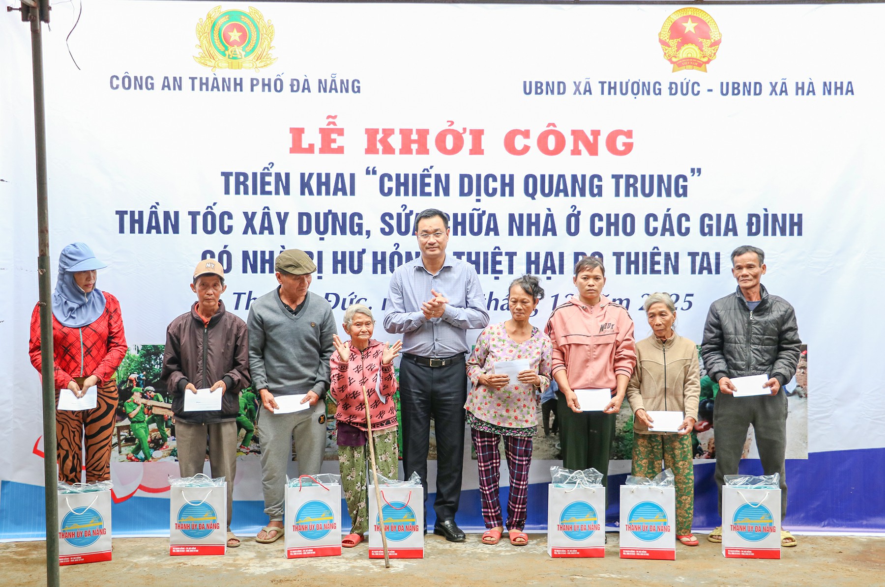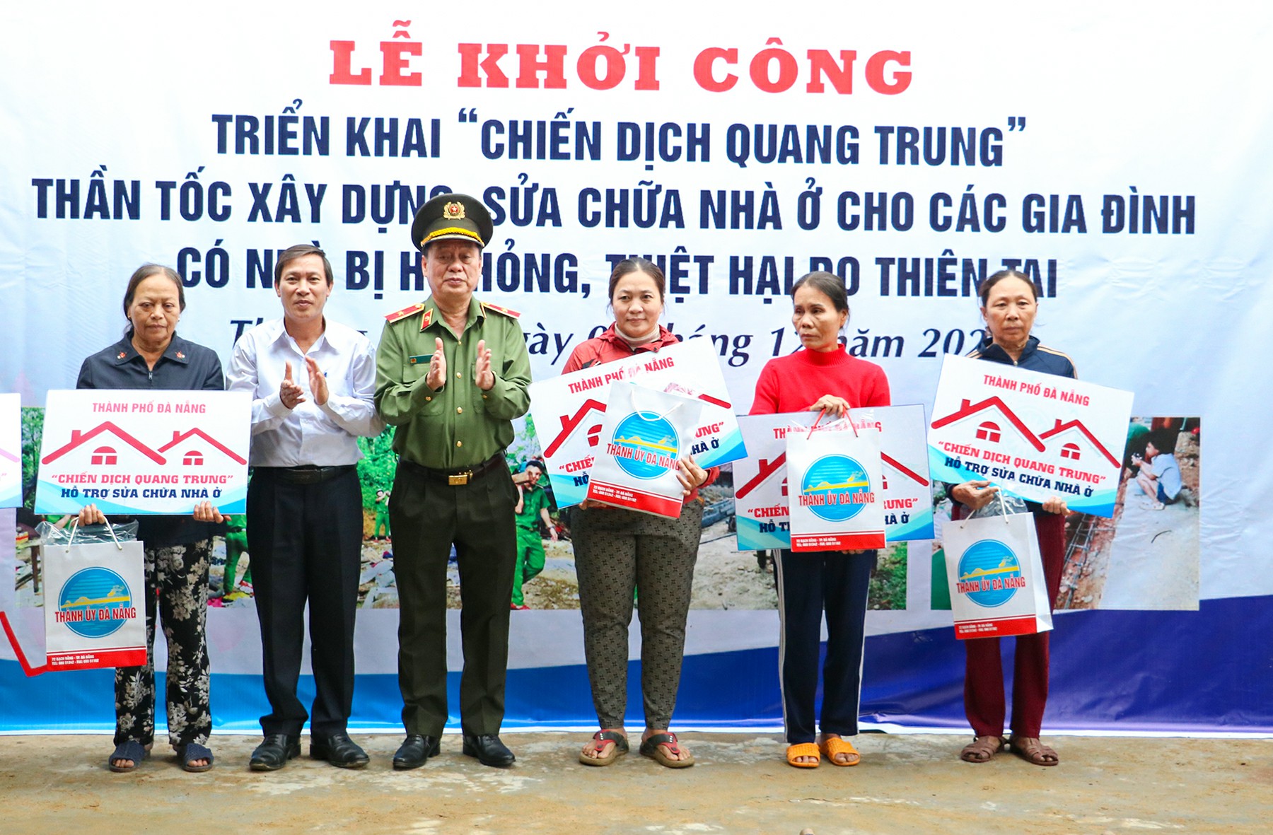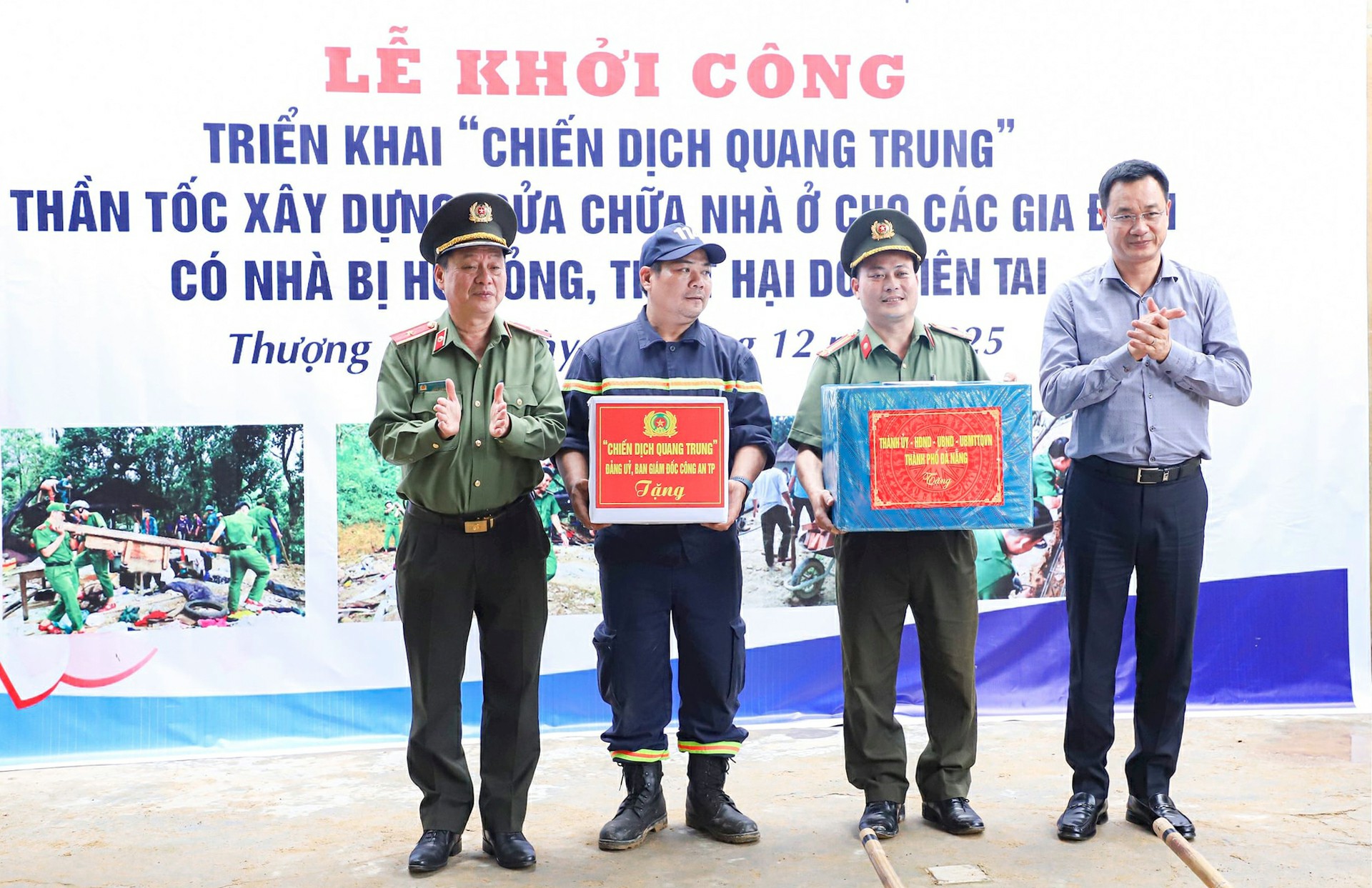 Phát biểu tại lễ khởi công, Giám đốc Công an thành phố Nguyễn Hữu Hợp cho biết lực lượng Công an Đà Nẵng được Bộ Công an, Thành ủy và UBND thành phố giao nhiệm vụ chủ công trong chiến dịch xây dựng, sửa chữa 271 căn nhà tại 22 xã, phường. Trong đó, 213 căn nhà hư hại nặng phải hoàn thành trước 31/12/2025 và 58 căn nhà sập hoàn toàn phải hoàn thành trước 31/01/2026. Đây là nhiệm vụ khẩn trương, khối lượng lớn, điều kiện thi công khó khăn, nhất là tại các địa bàn vùng cao.