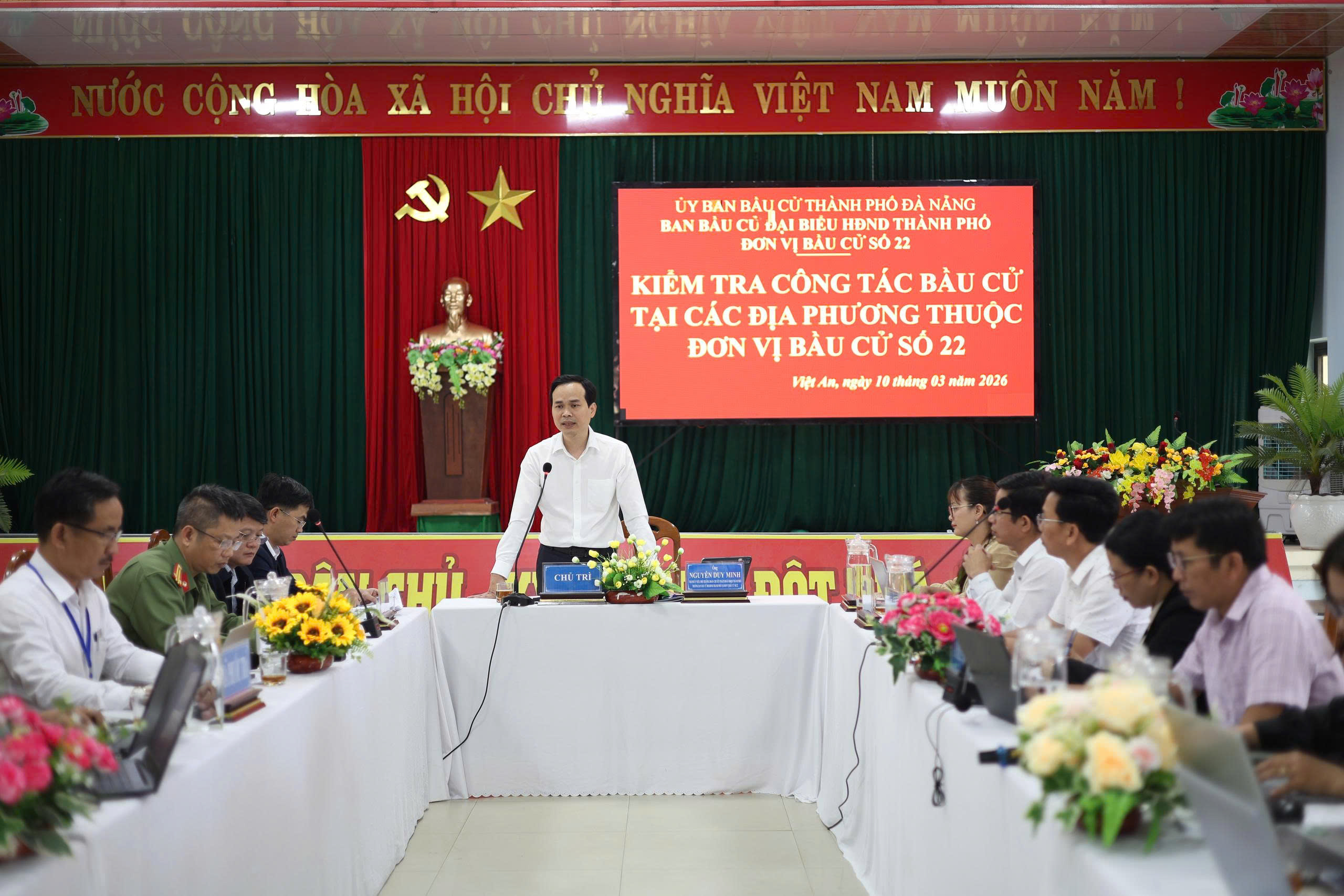 Sáng 10-3, đoàn công tác của UBBC thành phố Đà Nẵng do Thành ủy viên, Phó Trưởng đoàn chuyên trách Đoàn Đại biểu Quốc hội đơn vị Đà Nẵng Nguyễn Duy Minh làm trưởng đoàn có buổi kiểm tra thực tế tại điểm bầu cử số 22, gồm các xã Việt An, Hiệp Đức và Phước Trà.
