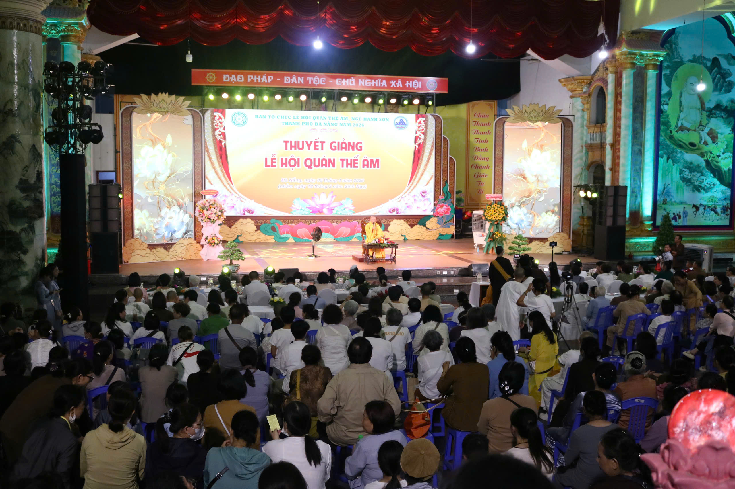 Trong khuôn khổ Lễ hội Quán Thế Âm Ngũ Hành Sơn thành phố Đà Nẵng năm 2026, tối 05-4, tại sân khấu chính chùa Quán Thế Âm diễn ra chương trình thuyết giảng chủ đề Lễ hội, thu hút đông đảo tăng ni, phật tử, người dân và du khách tham dự.