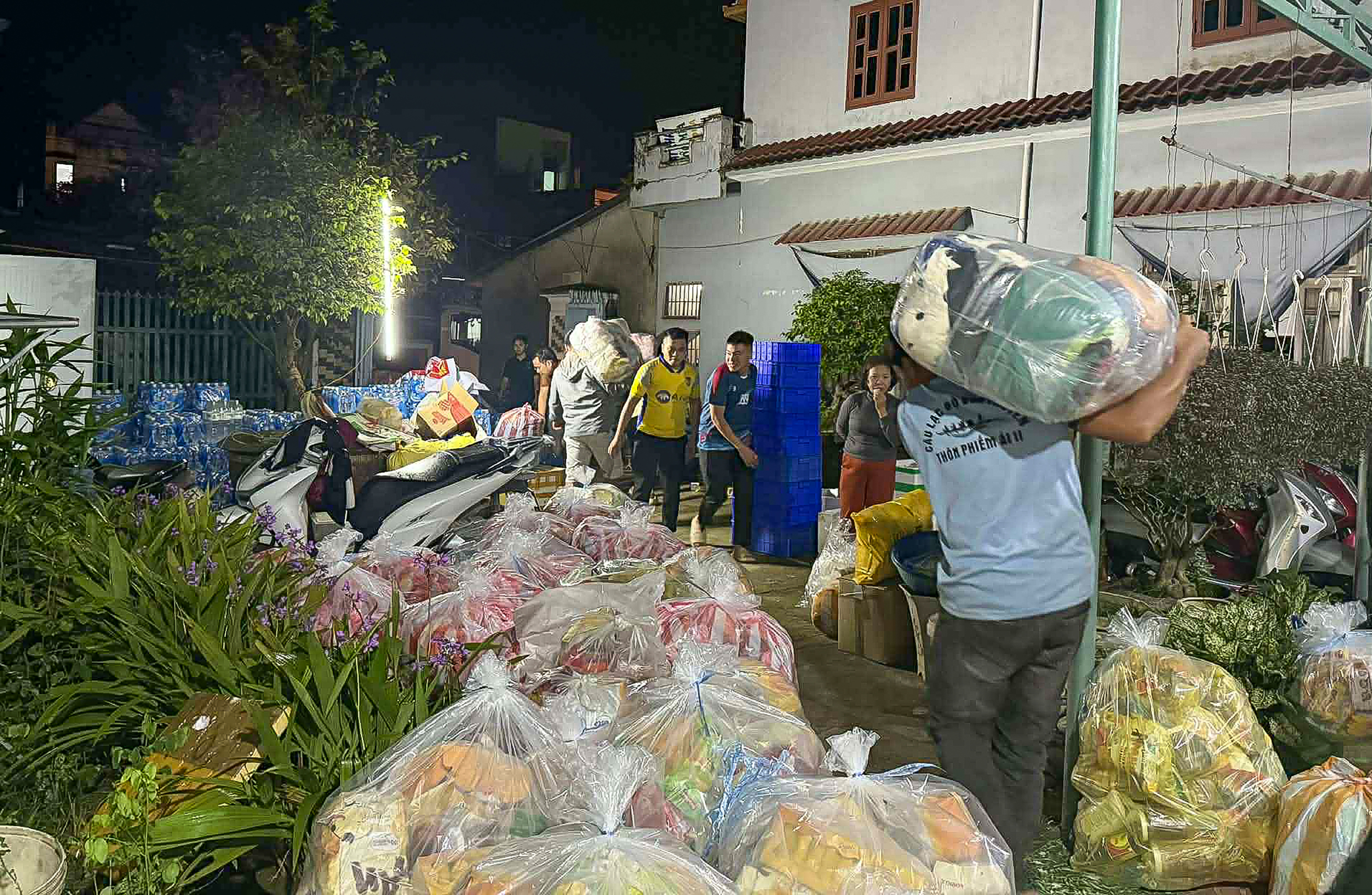 Tại các điểm tập kết hàng cứu trợ, những chiếc xe chở đầy ắp hàng hóa ra vào liên tục. Mì tôm, nước uống, thuốc cảm sốt, băng gạc và hàng loạt vật dụng thiết yếu… tất cả đều chung một tấm lòng hướng về đồng bào vùng lũ.