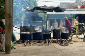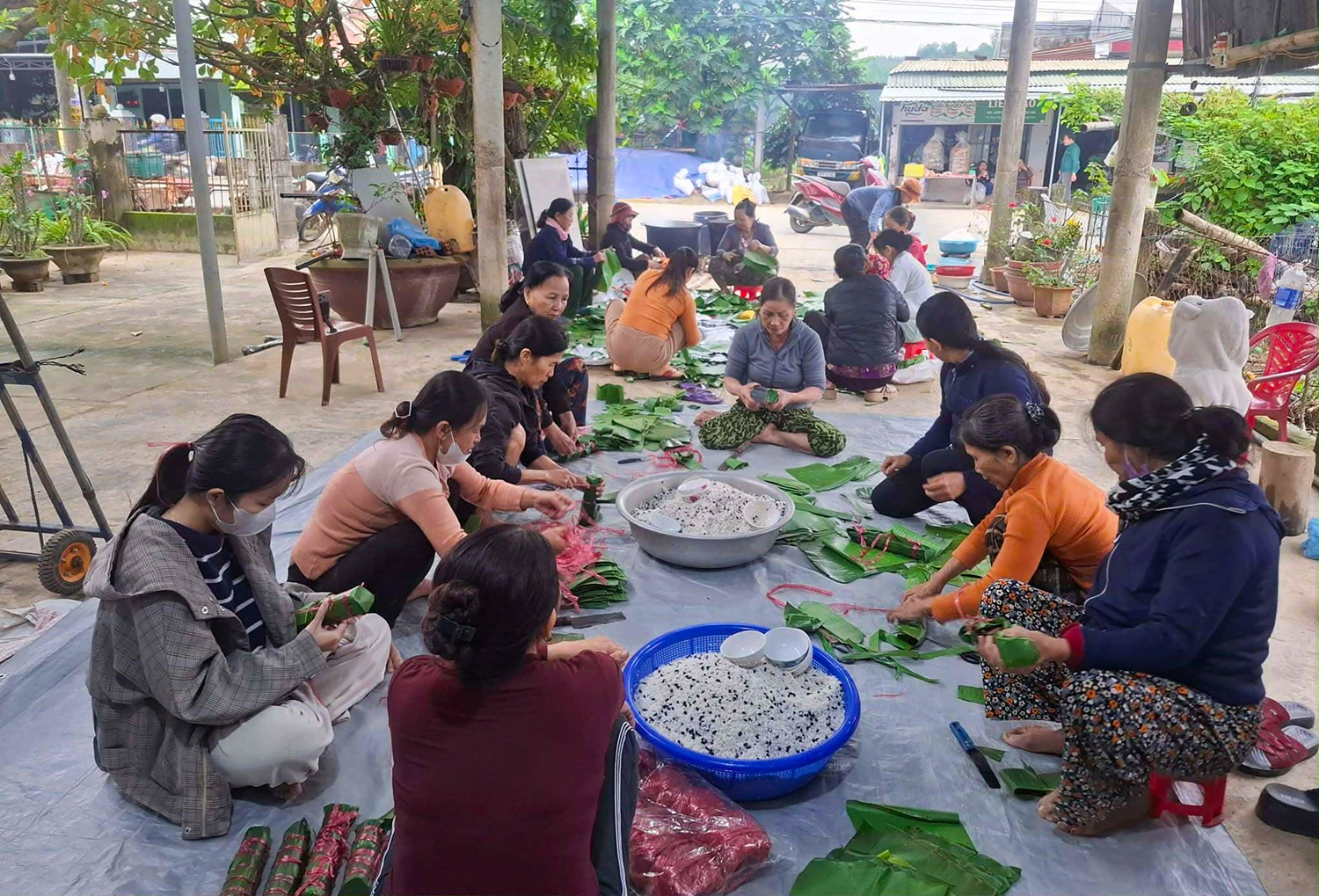 Từ sáng sớm, chị Phương cùng nhiều chị em phụ nữ thôn Mỹ Tân chung tay gói 300 đòn bánh tét. Người góp nếp, người góp củi, ai có công góp công, ai có ít tiền góp tiền. Giữa những gương mặt lam lũ, từng bàn tay thoăn thoắt gói bánh lại hiện lên tinh thần tương thân tương ái – điều luôn sáng lên mạnh mẽ nhất mỗi khi miền Trung oằn mình chống lũ.