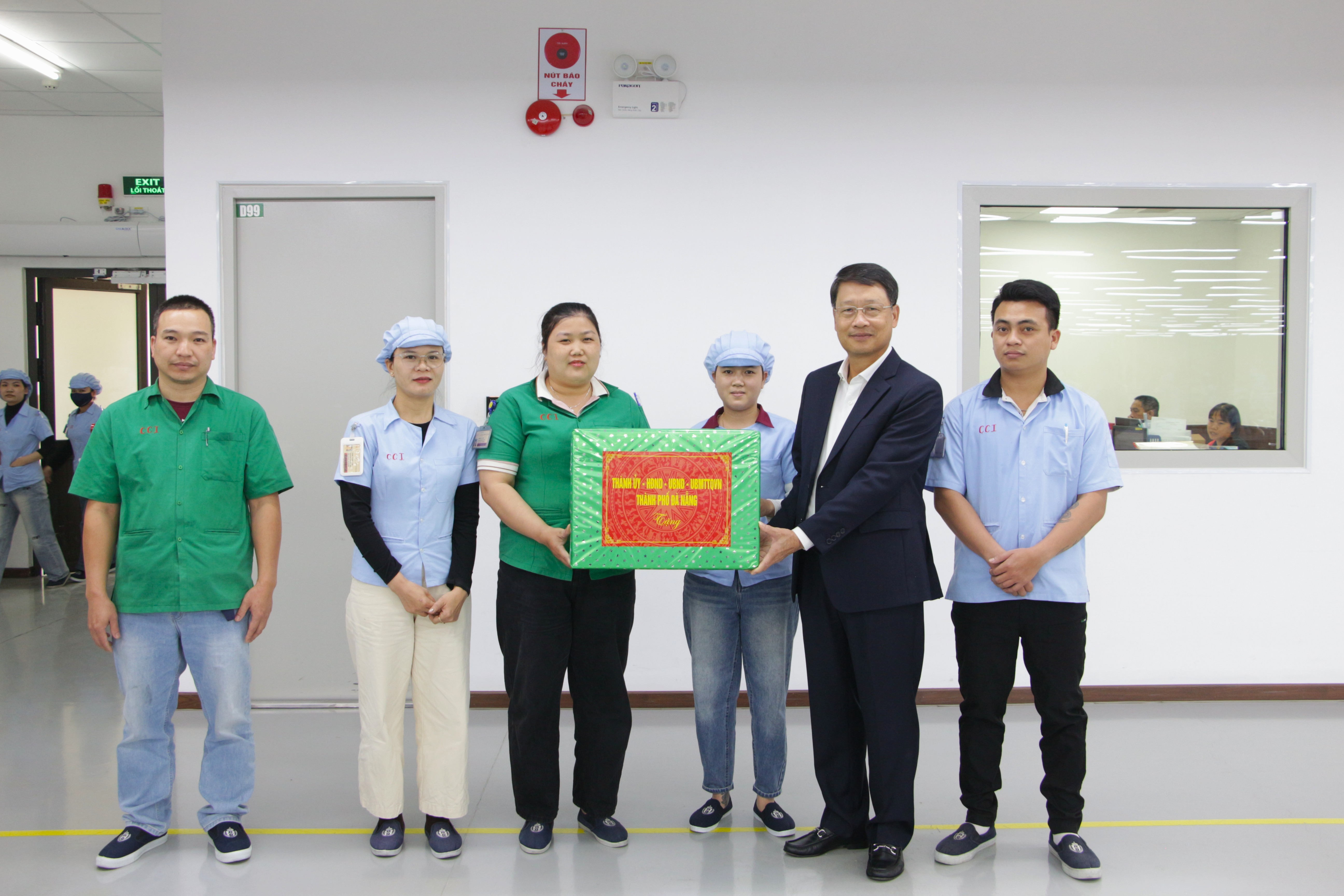 Phó Bí thư Thành ủy Ngô Xuân Thắng tặng quà động viên người lao động Công ty TNHH CCI Việt Nam.