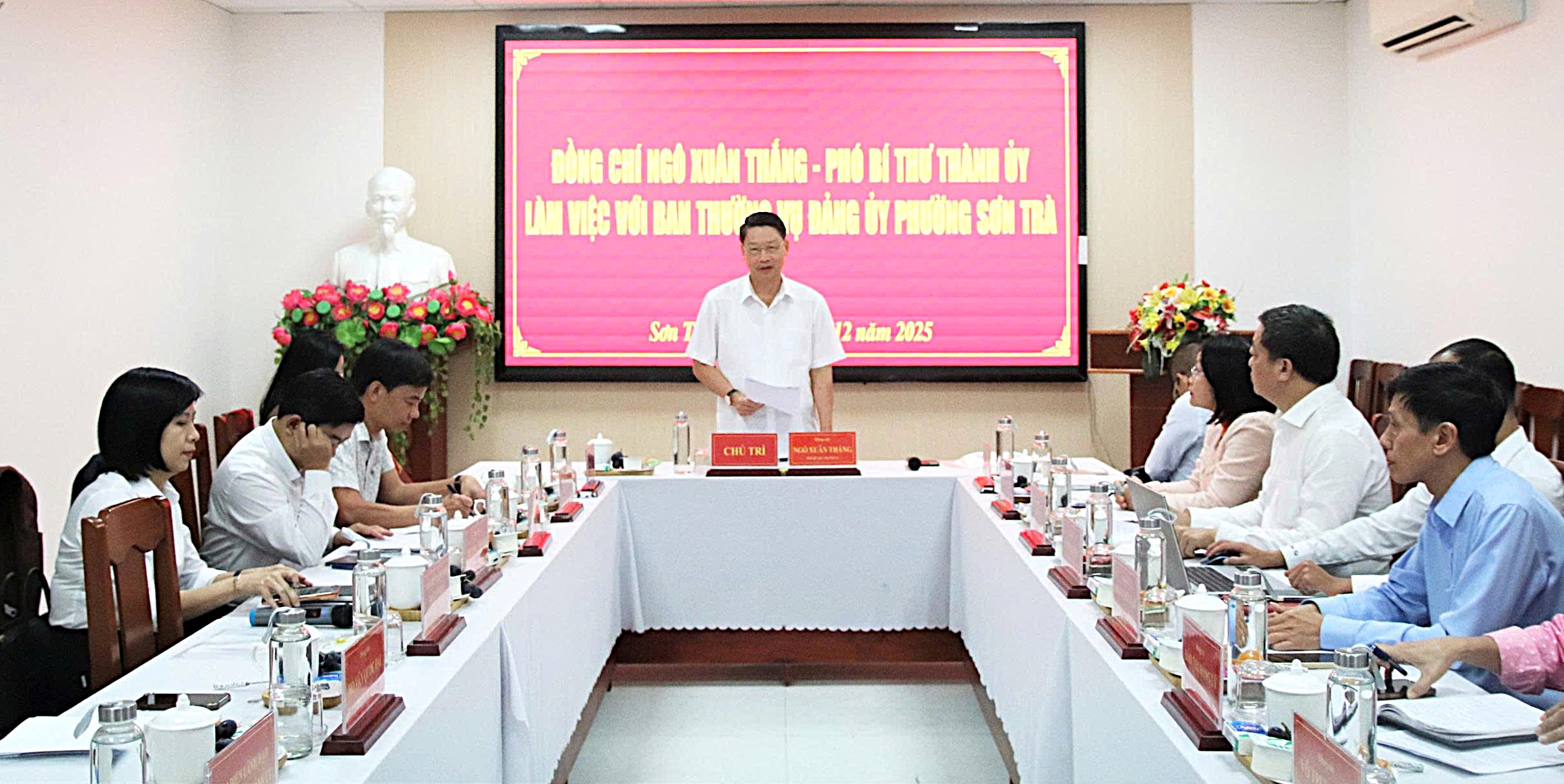 Sáng 16-12, Phó Bí thư Thành ủy Ngô Xuân Thắng chủ trì buổi làm việc với Ban Thường vụ Đảng ủy phường Sơn Trà nhằm đánh giá tình hình thực hiện nhiệm vụ chính trị năm 2025, công tác xây dựng tổ chức cơ sở đảng, công tác chuẩn bị bầu cử đại biểu Quốc hội khóa XVI và HĐND các cấp nhiệm kỳ 2026–2031; việc chăm lo các đối tượng chính sách, bảo trợ xã hội nhân dịp Tết Nguyên đán Bính Ngọ 2026 và xác định nhiệm vụ trọng tâm trong thời gian đến.