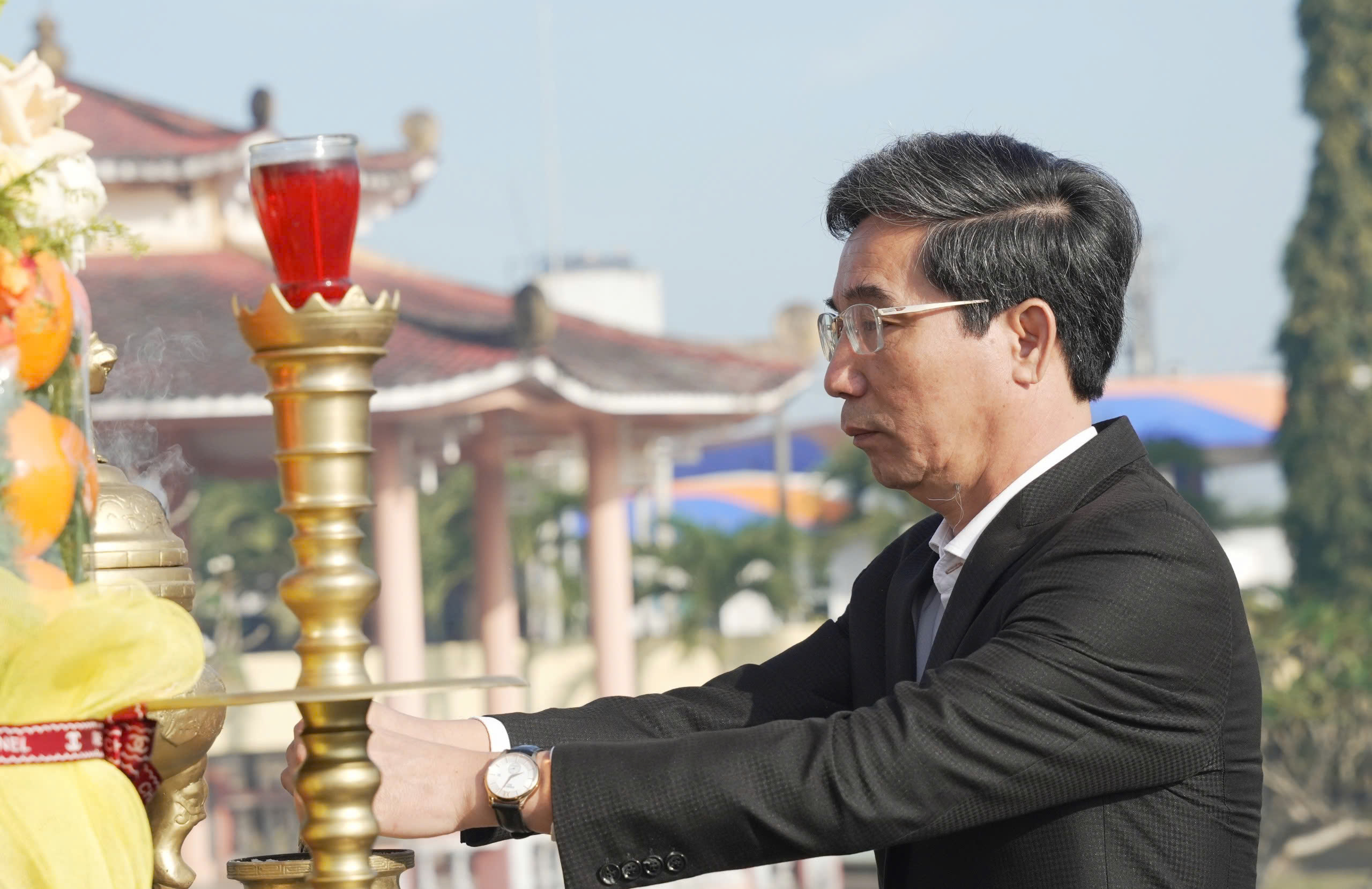 Sáng cùng ngày, Phó Chủ tịch UBND thành phố Trần Chí Cường đến dâng hoa, dâng hương tưởng niệm các anh hùng liệt sĩ tại Nghĩa trang liệt sĩ Thăng Bình.
