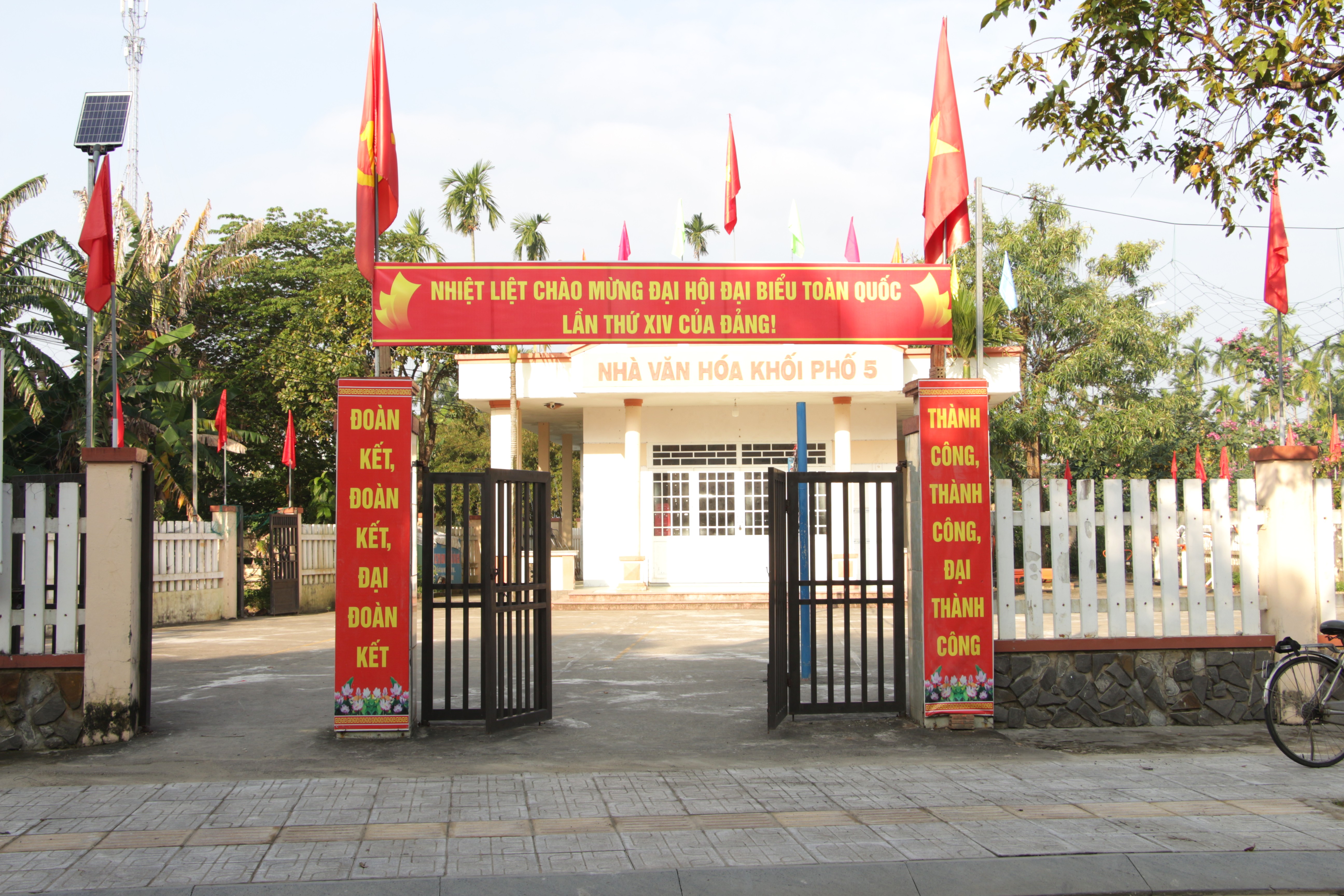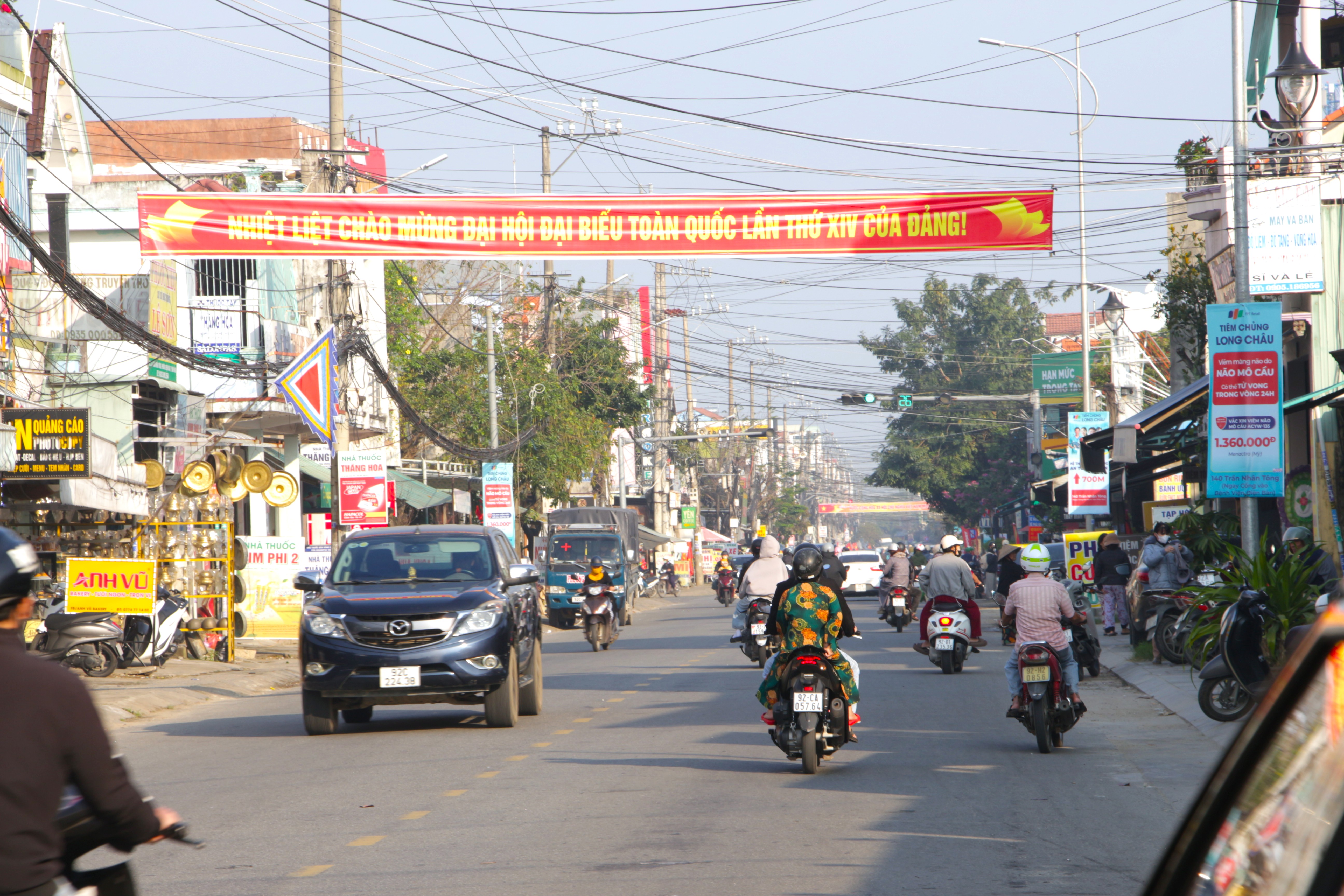 Các trụ sở trên địa bàn phường Điện Bàn treo pano, băng rôn tuyên truyền chào mừng Đại hội Đảng toàn quốc lần thứ XIV.
