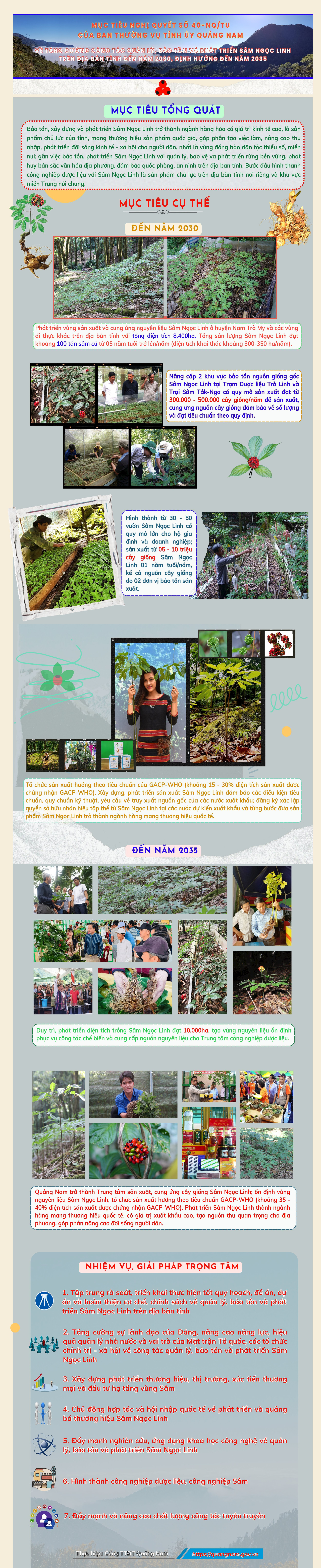 Để sớm đưa cây Sâm Ngọc Linh thành cây trồng mũi nhọn, dẫn dắt nhiều ngành kinh tế khác, góp phần phát triển kinh tế - xã hội tại các vùng đồng bào dân tộc thiểu số, miền núi của tỉnh và vươn tầm thế giới; Ban Thường vụ Tỉnh ủy ban hành Nghị quyết về tăng cường công tác quản lý, bảo tồn và phát triển Sâm Ngọc Linh trên địa bàn tỉnh đến năm 2030, định hướng đến năm 2035 với những mục tiêu, giải pháp cụ thể.