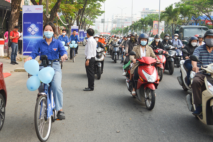 Đoàn thanh niên phường kết hợp dịch vụ xe đạp công cộng diễu hành dọc tuyến phố Nguyễn Hữu Thọ tuyên truyền, kêu gọi nhân dân hưởng ứng mô hình "Tuyến phố thanh toán không dùng tiền mặt"