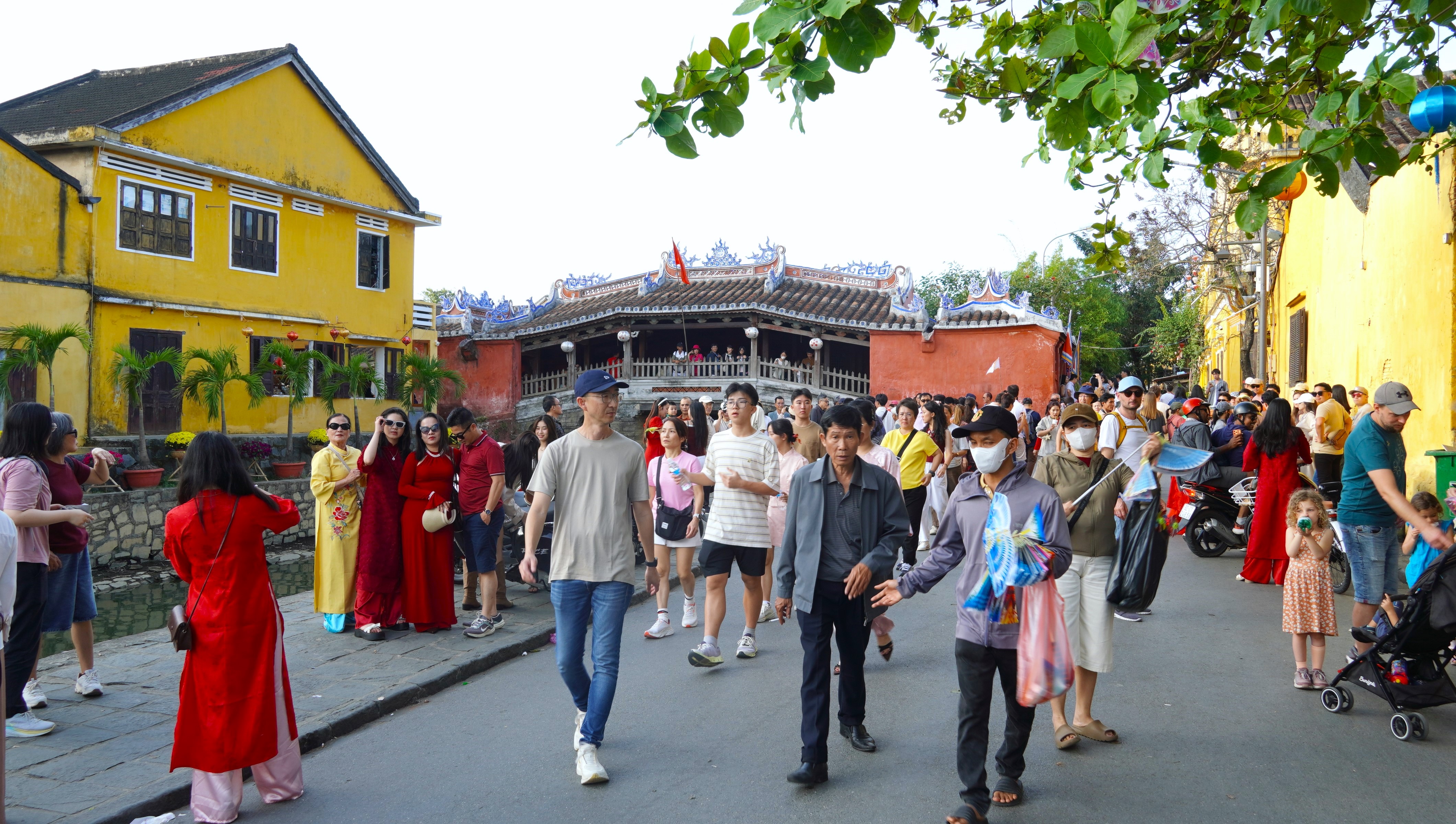 Khu vực trước cổng chợ Hàn (phường Hải Châu) đông đúc du khách, nhưng vỉa hè bị chiếm dụng khiến nhiều người phải di chuyển dưới lòng đường