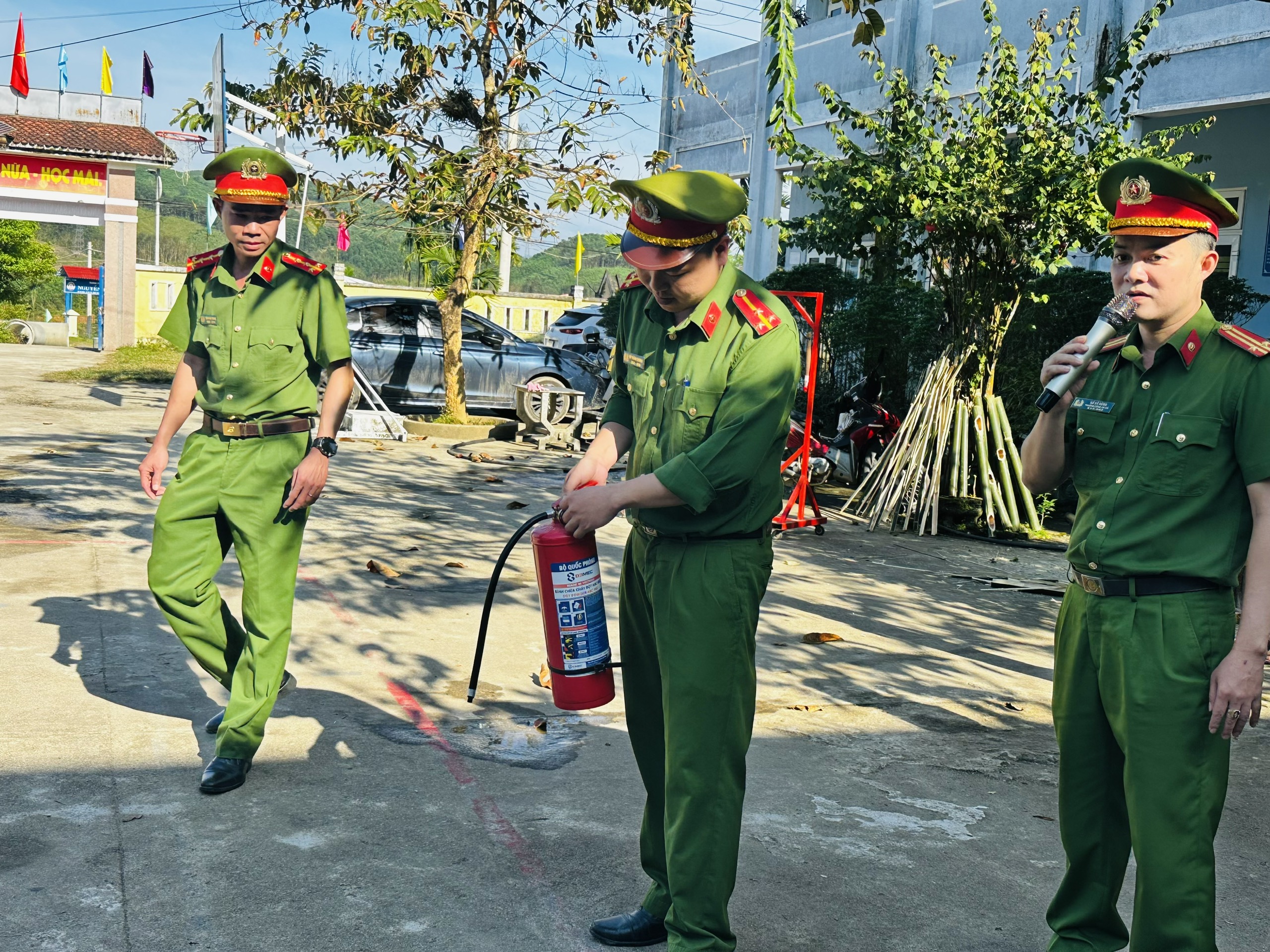 Học sinh và giáo viên được hướng dẫn kỹ năng nhận biết, xử lý ban đầu khi xảy ra cháy, kỹ năng thoát nạn an toàn, cùng các biện pháp phòng ngừa tại gia đình và khu nội trú. Đặc biệt, các em còn được trực tiếp thực hành thao tác sử dụng bình chữa cháy, qua đó củng cố kiến thức và kỹ năng xử lý tình huống thực tế.