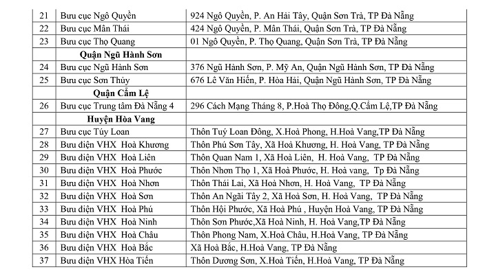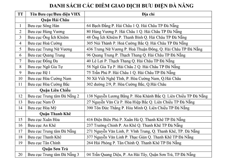 Danh sách 27 bưu cục và 10 Bưu điện văn hoá xã tiếp nhận làm lý lịch tư pháp trên địa bàn thành phố Đà Nẵng: