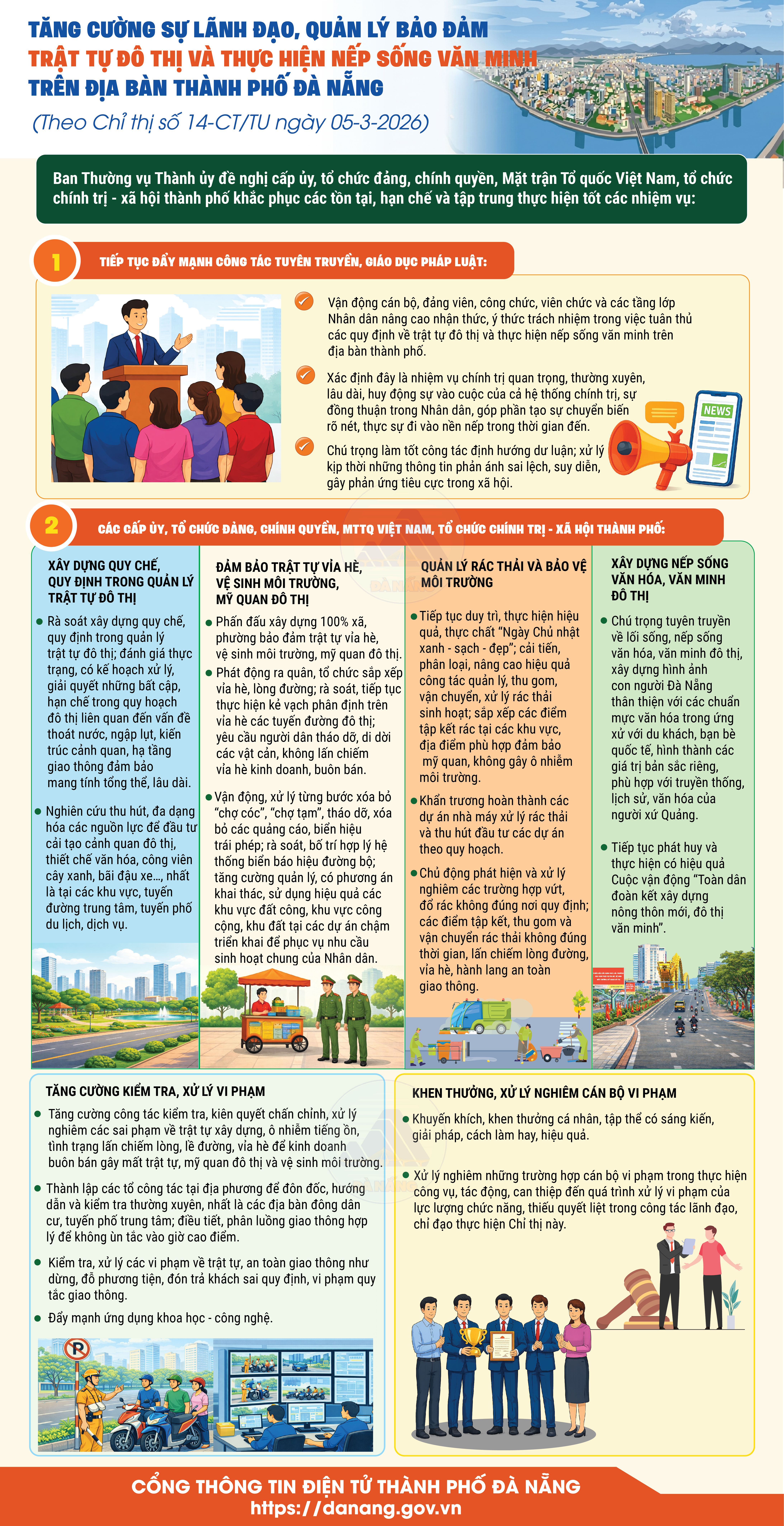 Ngày 05-3, Thành ủy ban hành Chỉ thị số 14-CT/TU về tăng cường sự lãnh đạo, quản lý bảo đảm trật tự đô thị và thực hiện nếp sống văn minh trên địa bàn thành phố Đà Nẵng.