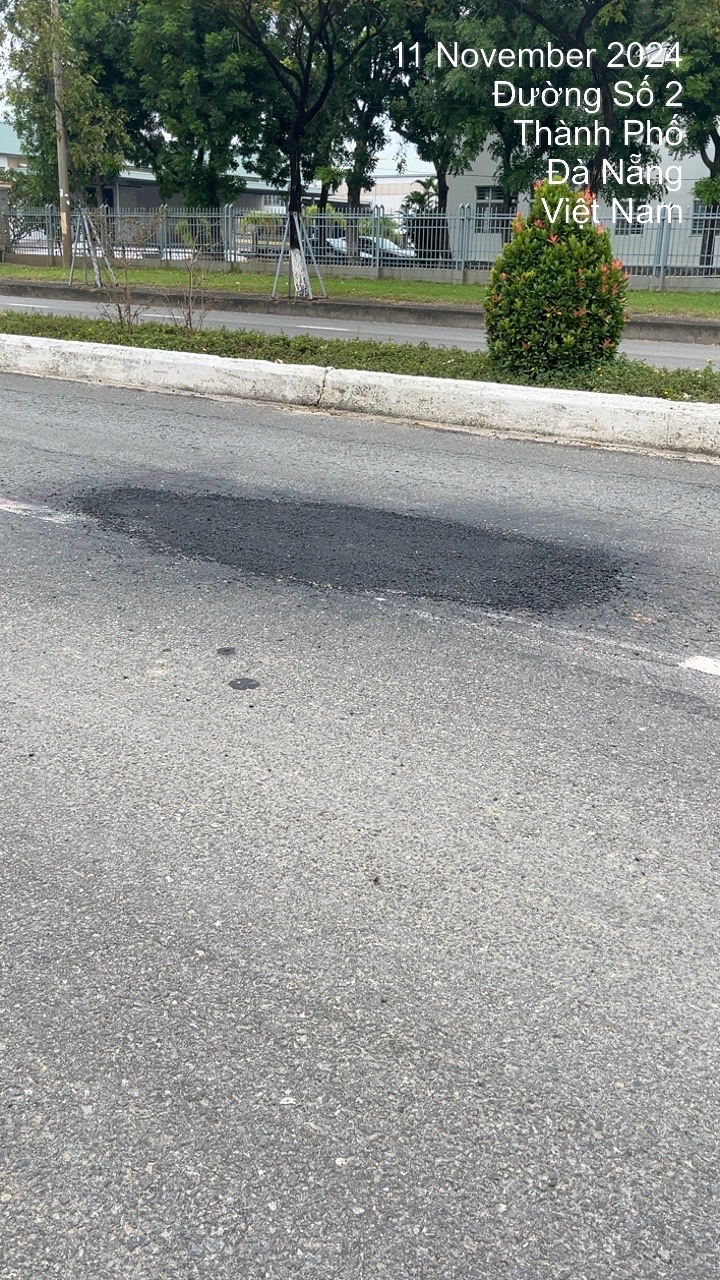 Ngày 11-11, Công ty Phát triển và Khai thác hạ tầng KCN Đà Nẵng có văn bản số 1022/CTy-KTh về việc phản hồi phản ánh của Trung tâm Thông tin và giám sát, điều hành thông minh Đà Nẵng liên quan đến Đường số 2 Khu công nghiệp Hòa Khánh (trước mặt công ty Nhựa Chin Huei) xuất hiện 1 ổ voi rất to gây nguy hiểm khi tham gia giao thông.