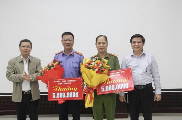 Chiều 22-2, lãnh đạo quận ủy, UBND quận Thanh Khê đến khen thưởng đột xuất lực lượng Công an và Viện KSND quận vì thành tích trong việc phối hợp, hoàn tất nhanh thủ tục khởi tố, bắt tạm giam 3 đối tượng có hành vi côn đồ hành hung hai nữ nhân viên gác tàu.
