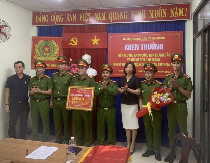 Sáng 9-3, thừa ủy quyền của Chủ tịch UBND thành phố, Đại tá Phan Văn Dũng, Phó Giám đốc Công an TP đã đến chúc mừng, động viên và trao thưởng 5 triệu đồng cho Công an phường Hòa Khánh Bắc (quận Liên Chiểu) về thành tích khám phá thành công nhiều vụ án, vụ việc liên quan đến ANTT trên địa bàn.