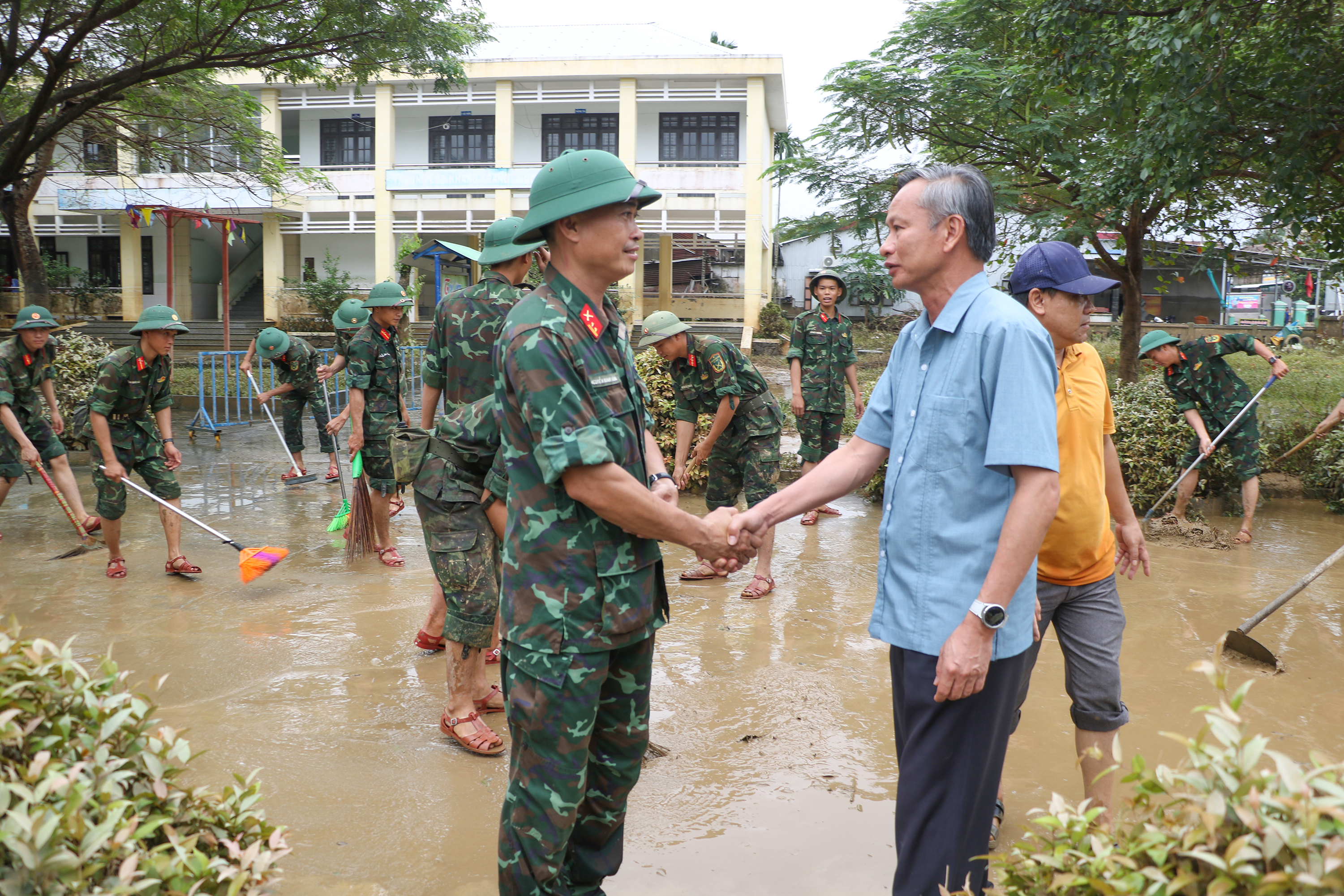 Phó Chủ tịch HĐND thành phố Đoàn Ngọc Hùng Anh động viên lực lượng quân đội dọn dẹp bùn non tại trường tiểu học Trần Hưng Đạo, xã Gò Nổi.