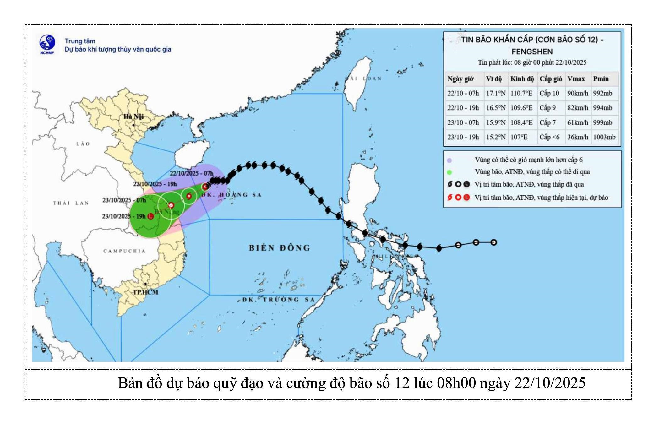 Hồi 7 giờ ngày 22-10, vị trí tâm bão ở vào khoảng 17,1 độ Vĩ Bắc; 110,7 độ Kinh Đông, trên vùng biển phía Tây Bắc đặc khu Hoàng Sa, cách Tp. Đà Nẵng khoảng 280km về phía Đông Đông Bắc. Sức gió mạnh nhất vùng gần tâm bão mạnh cấp 10 (89-102km/giờ), giật cấp 12. Di chuyển theo hướng Tây Tây Nam, tốc độ khoảng 10km/h.