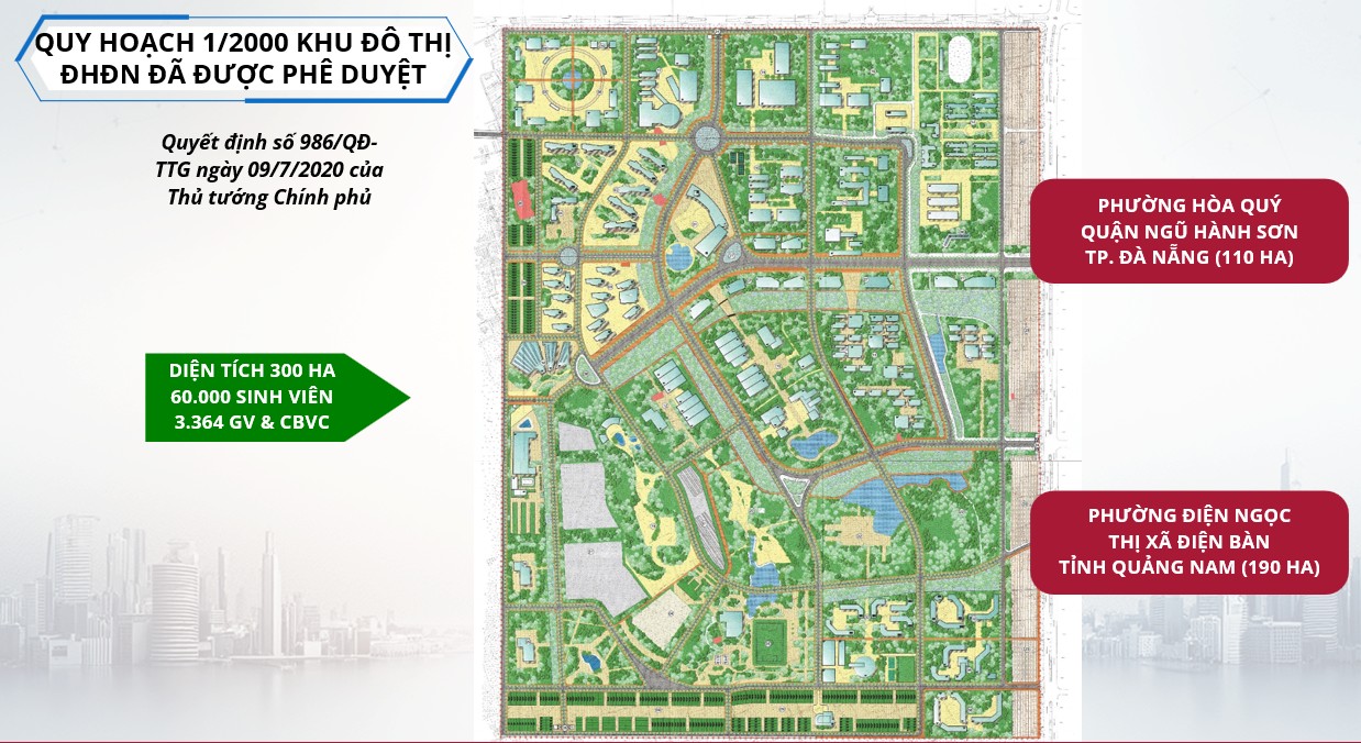 Dự án xây dựng ĐHĐN được Thủ tướng Chính phủ phê duyệt quy hoạch phân khu tỷ lệ 1/2000 với tổng diện tích 300ha, trong đó phần diện tích tại phường Hoà Quý, quận Ngũ Hành Sơn, thành phố Đà Nẵng (cũ) là 110ha; phần diện tích tại phường Điện Ngọc, thị xã Điện Bàn, tỉnh Quảng Nam (cũ) là 190ha.