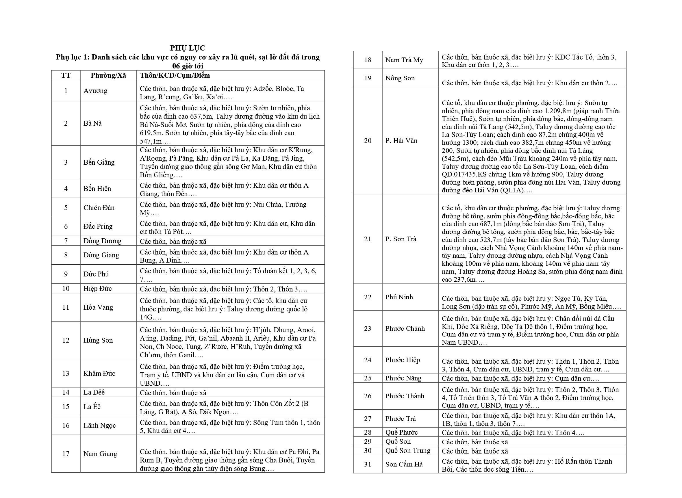 Cảnh báo, trong 06 giờ tới, nguy cơ xảy ra lũ quét trên các sông, suối nhỏ vùng núi; sạt lở đất trên sườn dốc, sụt lún đất tại nhiều xã/ phường thuộc thành phố Đà Nẵng.