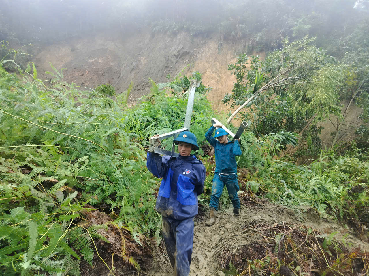 Trong khi đó, ngành Điện lực cũng đã cử công nhân chở thiết bị, vật tư lên khắc phục các trụ điện bị hư hại trên địa bàn xã với quyết tâm đóng điện sớm nhất có thể.
