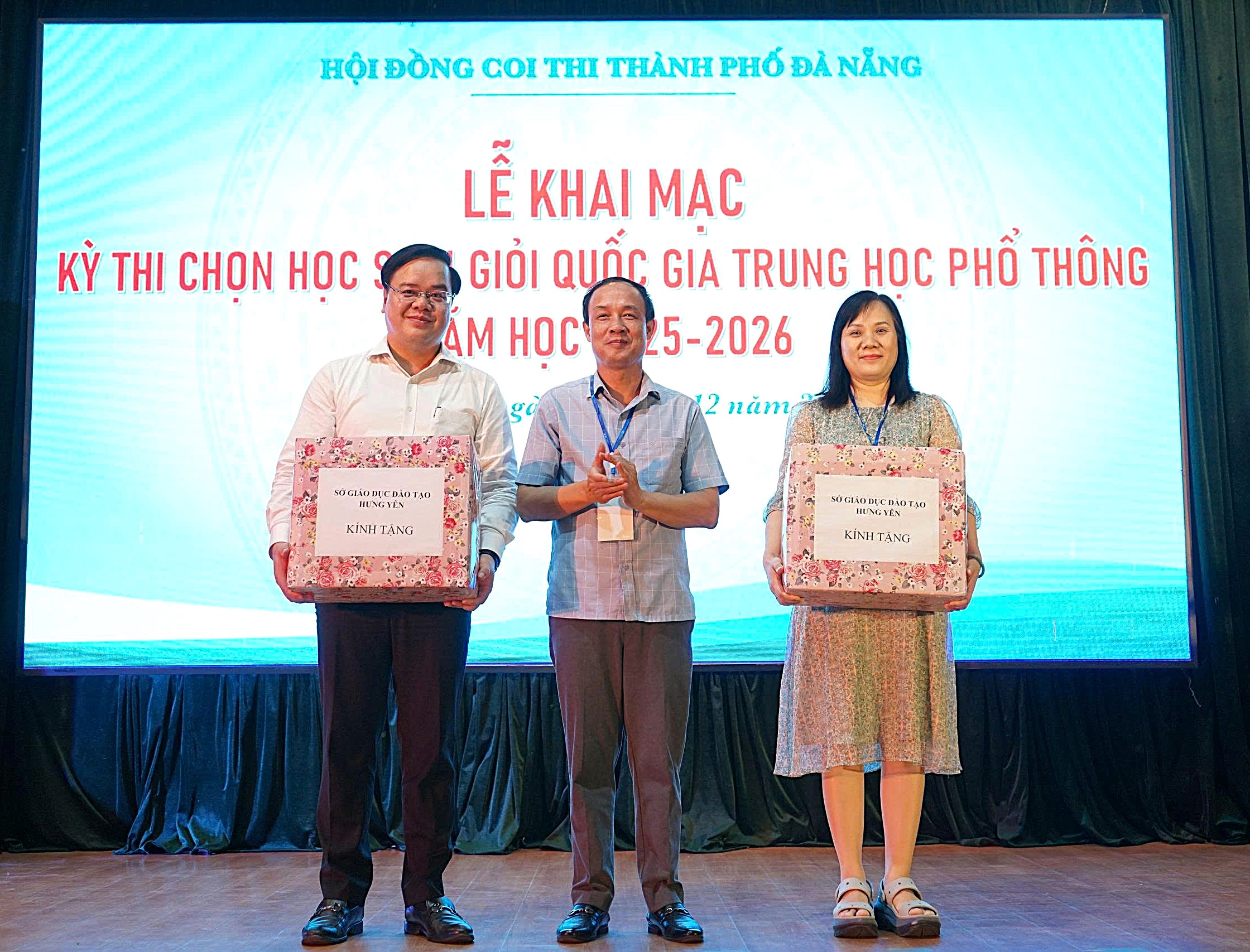 Đại diện lãnh đạo Sở GD&ĐT tỉnh Hưng Yên tặng quà Sở GD&ĐT TP Đà Nẵng và Trường THPT Chuyên Lê Quý Đôn.