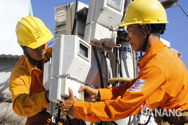 Công nhân Điện lực Đà Nẵng lắp đặt đồng hồ trên trụ điện.