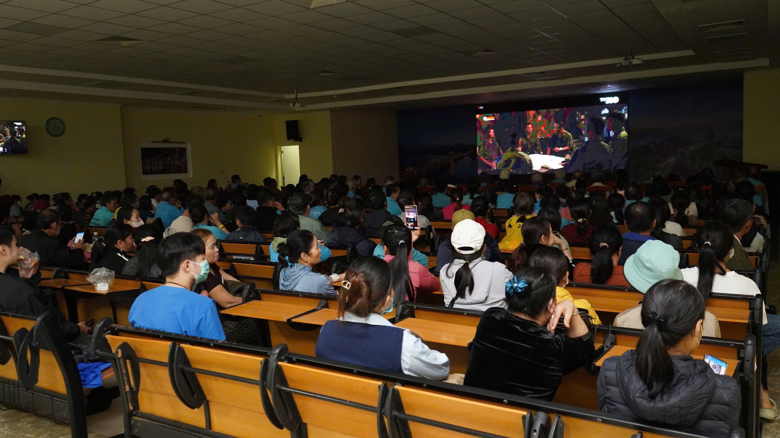 Khi những khung hình đầu tiên của phim “Mưa đỏ” phủ lên phông màn phía trước, cả hội trường như chùng xuống, lặng thinh và thầm kính. Ánh sáng từ màn hình hắt nhẹ lên từng gương mặt người xem, soi rõ những nếp nhăn đã hằn theo năm tháng của các bệnh nhân lớn tuổi đang ngồi thành hàng ngay ngắn.