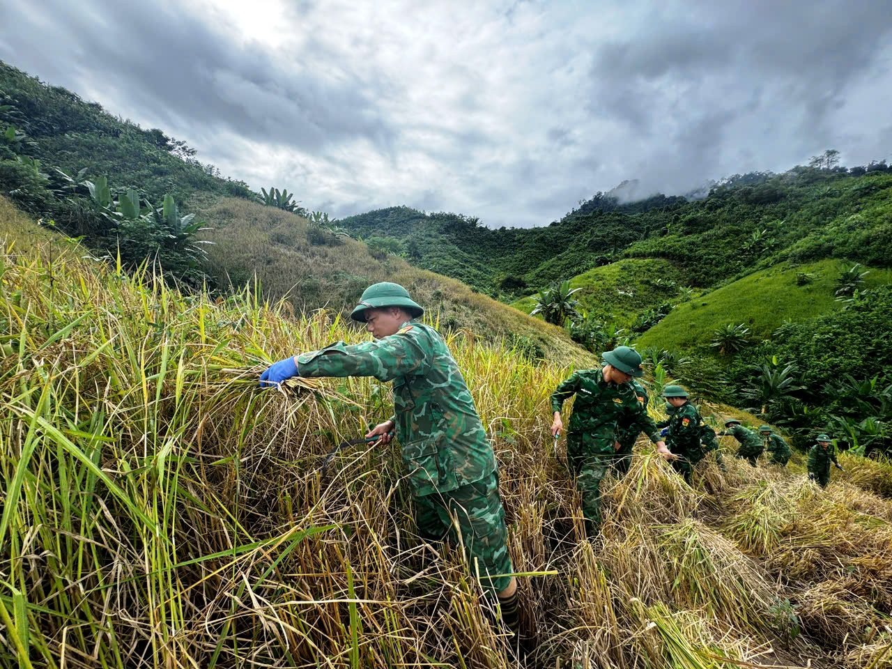 Bộ đội Đồn Biên phòng La Êê giúp dân thu hoạch lúa trước cơn bão số 13