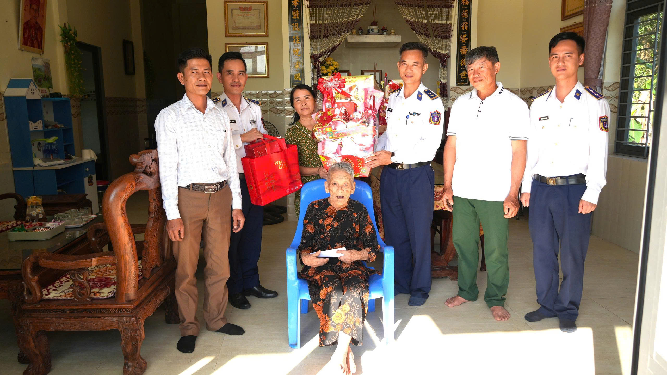 Lãnh đạo Bộ Tư lệnh Vùng Cảnh sát biển 2 tặng Mẹ Nguyễn Thị Minh quà Tết và tiền mặt trị giá hơn 6 triệu đồng.